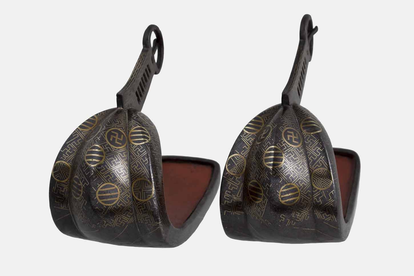 This example of Japanese iron stirrups is made in the traditional hato mune or dove’s breast shape, with a firm open platform inlayed with red lacquer, slightly curved forward so that the foot fits in. In the front extremity the stirrup has a rectangular buckle with several horizontal slots which also serve as a handle.