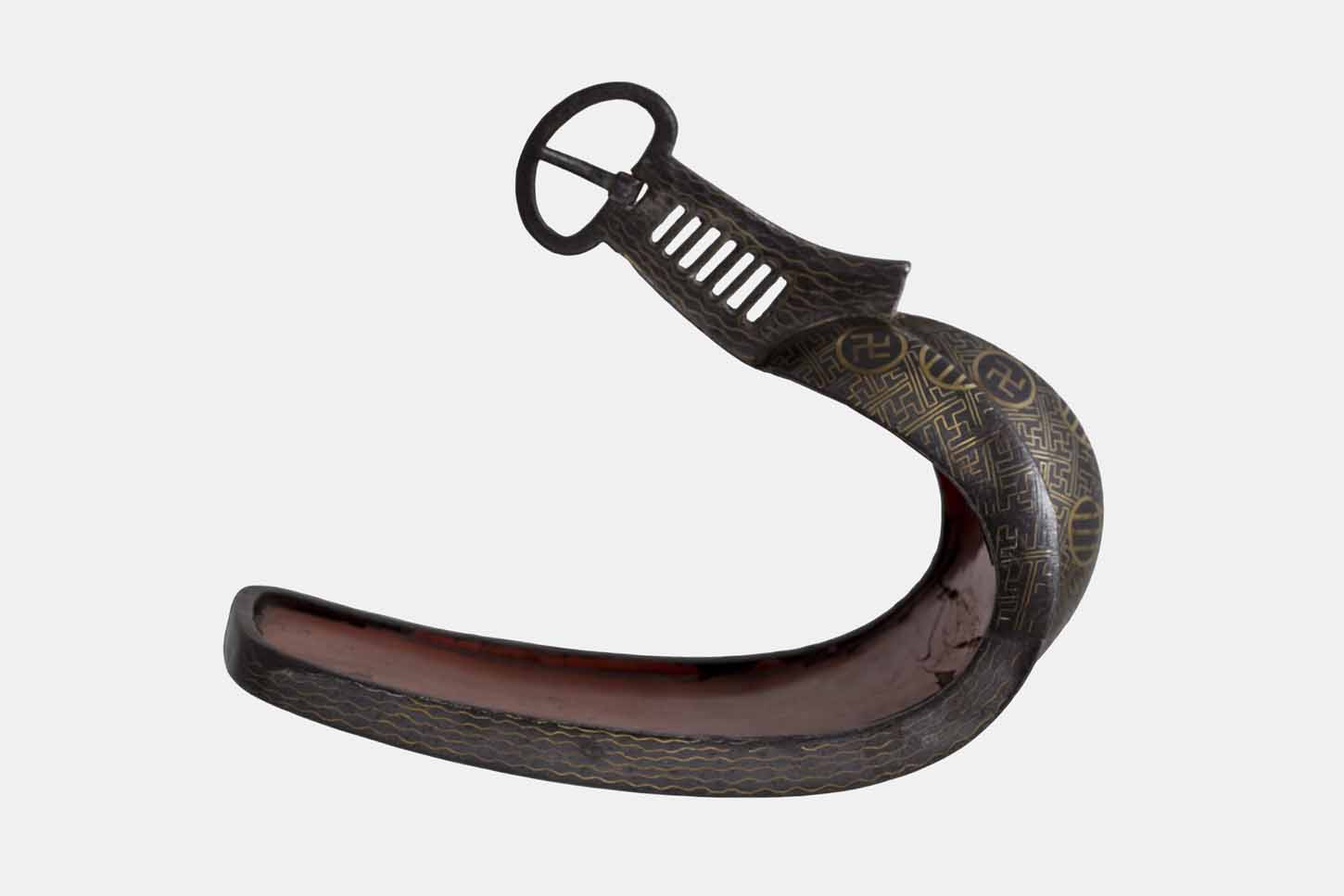 Toda a superfície exterior é decorada com dois Kamon ou “emblemas de família”, gravados e tauxiados a latão. O primeiro, é ornado com hiki ou listras pertencente à família Abe. O outro, está ligado à família Hachisuka, surgindo também como símbolo de felicidade a encimar templos budistas no Japão.