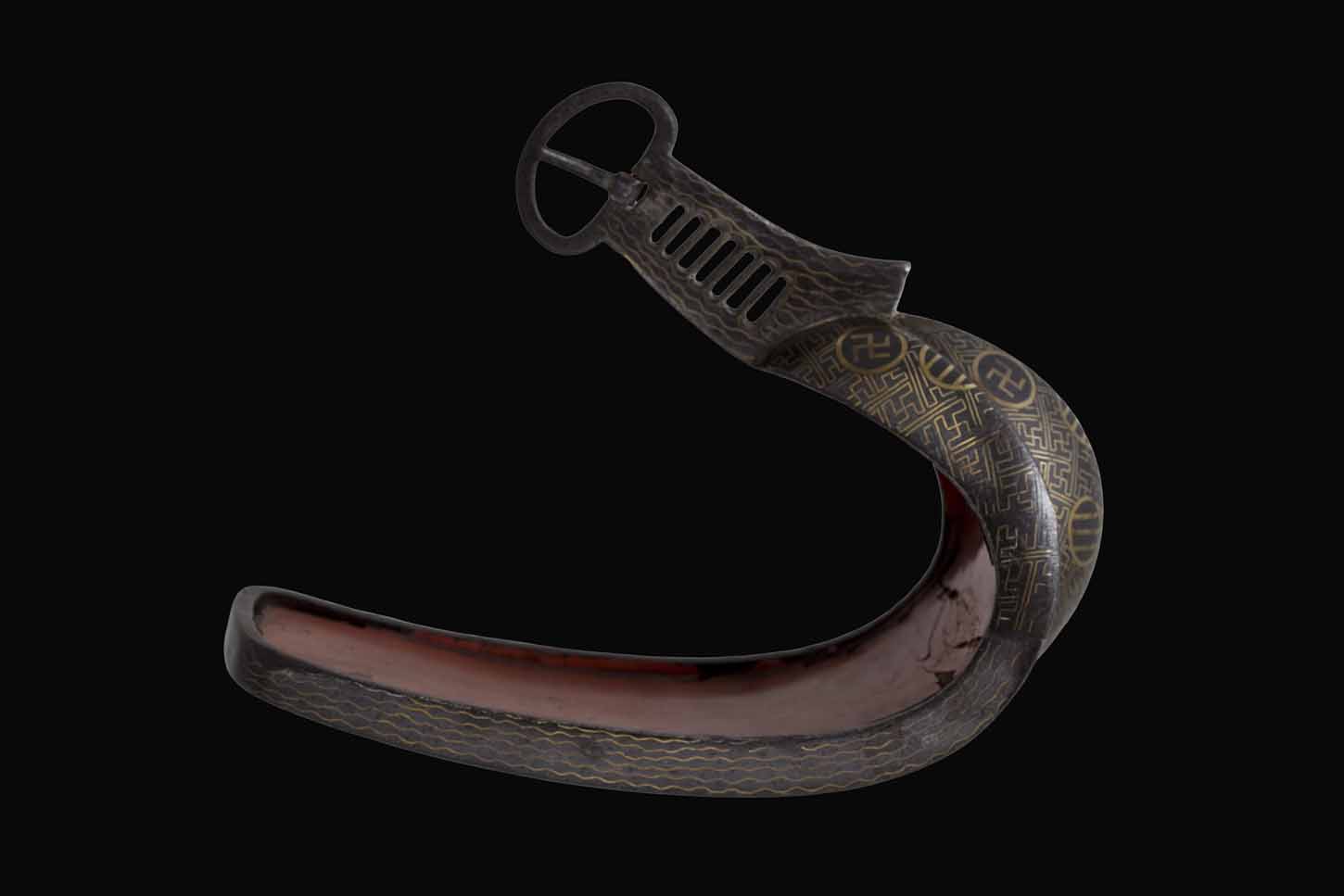 The whole of the exterior surface is decorated with two Kamon or “family crests”, engraved and inlayed in brass. The first is the hiki or stripes which belonged to the Abe family. The other is connected to the Hachikusa family being also a sign of happiness which tops Buddhist temples in Japan.