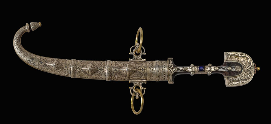 The blade, with the characteristic features of this sort of weapon, displays three golden circles and a pierced mark, symbolizing the Star of David.