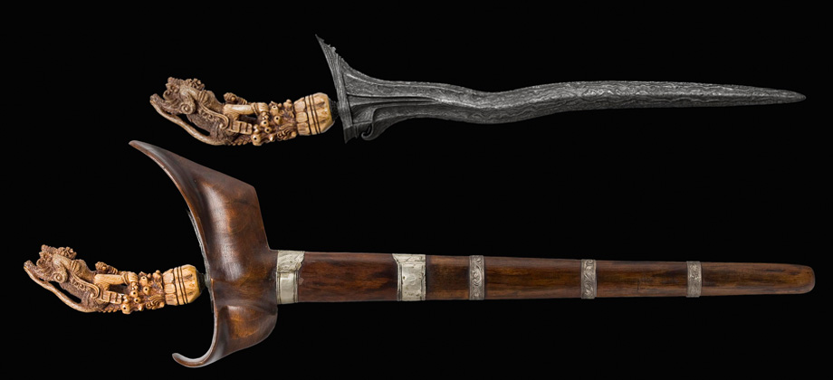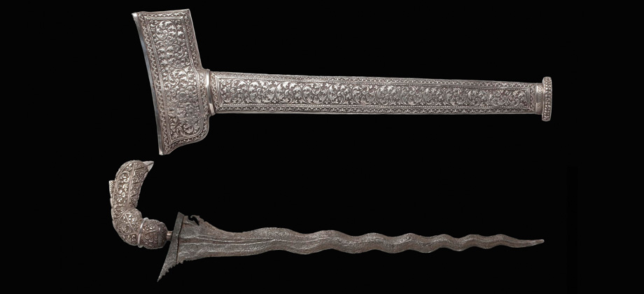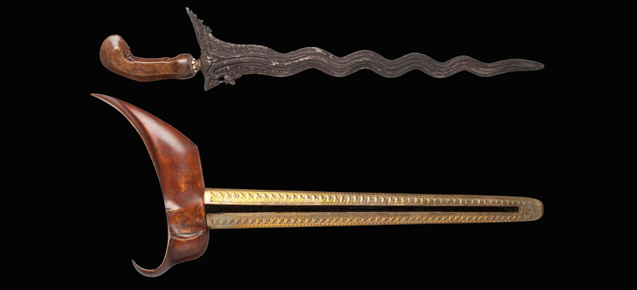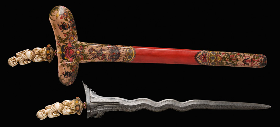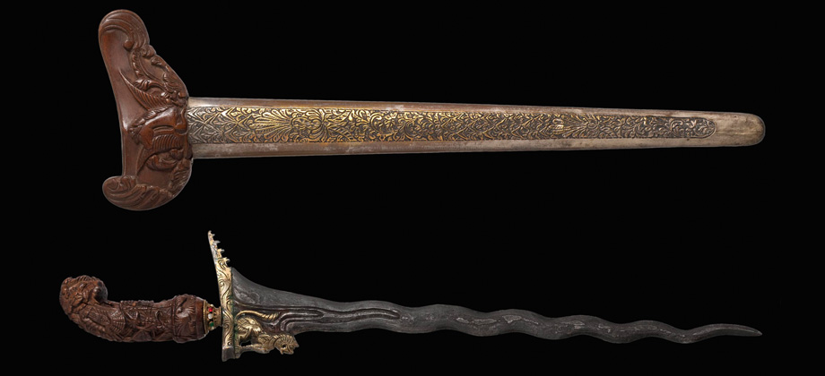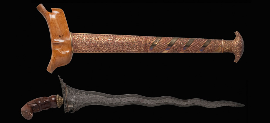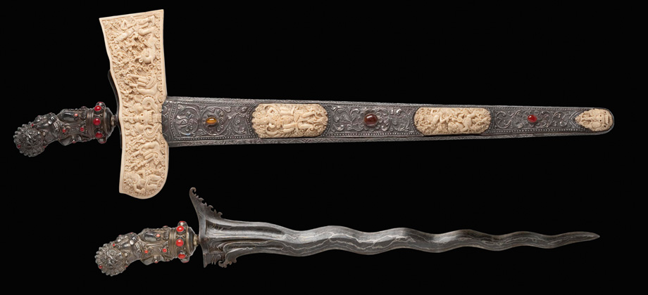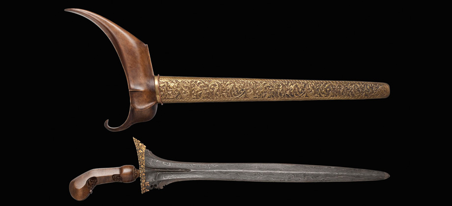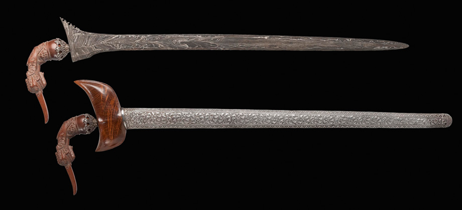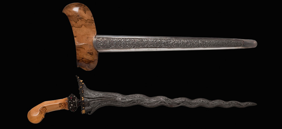 Steel, precious wood, golden silver, gold, rubis, grenades