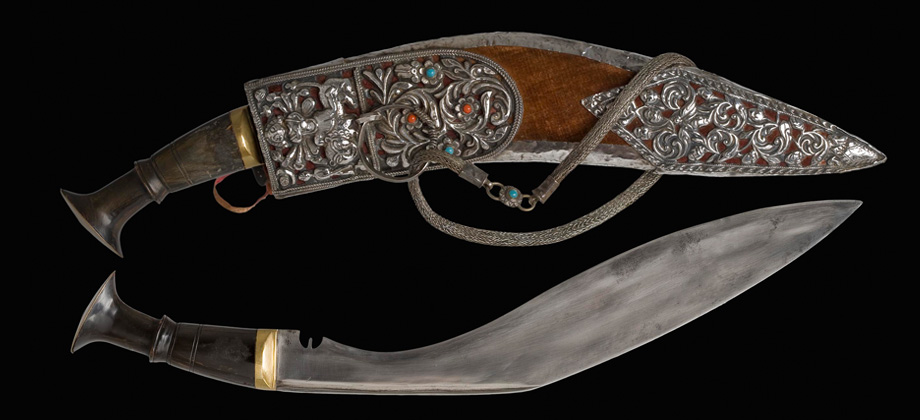 Steel, black buffalo horn, wood, velvet, silver, gems.