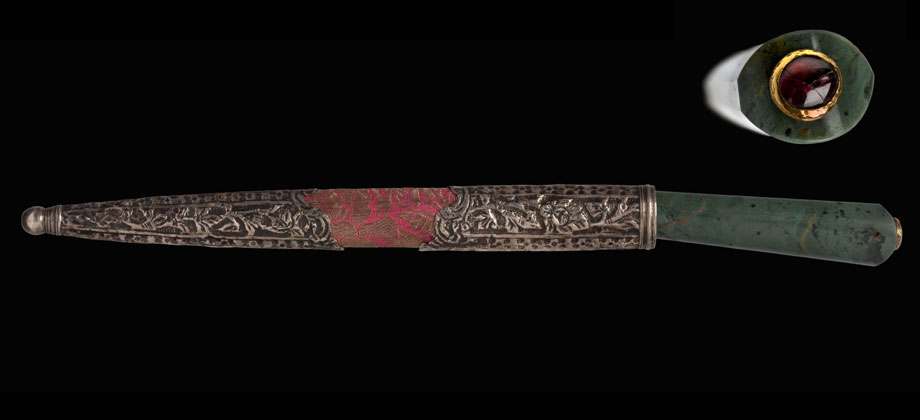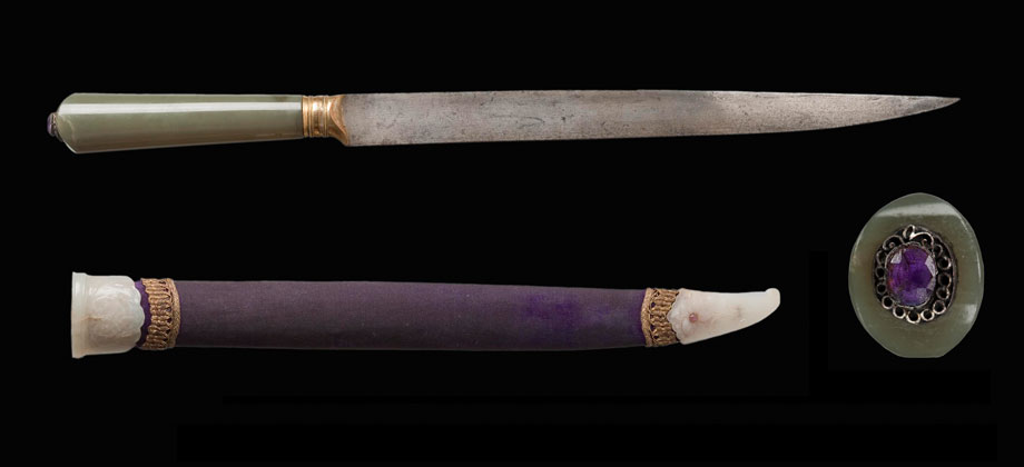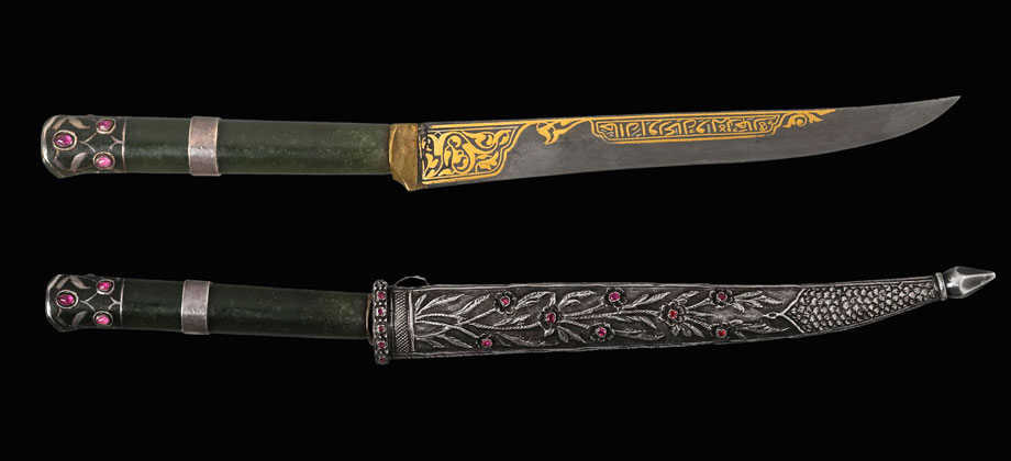 Steel, green jade, gold, ruby, wood, white jade, blue velvet