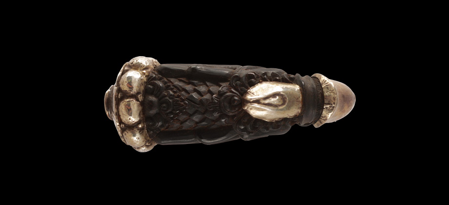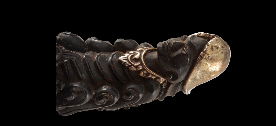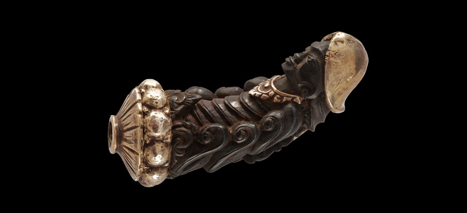 Raro punho de Kris do sul de Bali, finamente esculpido em madeira, (Pau Rosa), representando a terrível deusa Durga, com o corpo de insecto, "Kocet-Kocetan". O Selut, em prata simulando decoração de cabochons com pedraria, no dorso e cabeça da figura, rara decoração erótica em prata, contemporânea do Selut.
