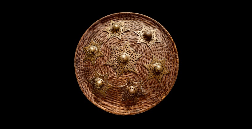 The Ache people of Central Sumatra are carrying this shield which is also locally known as Peurise Awe. It is a very big exemplar 40,5 cm in diameter, compared to the more common buckler size 32-38 cm. It is made of spiral cane densely braided with Rattan fibers and decorated with engraved and pierced seven pointed brass stars, six around and a big central one. Minor dammge to the rattan binding at the rim.