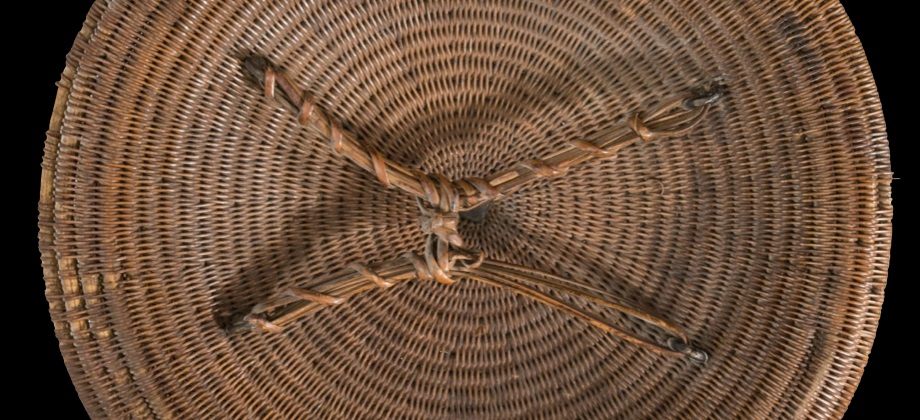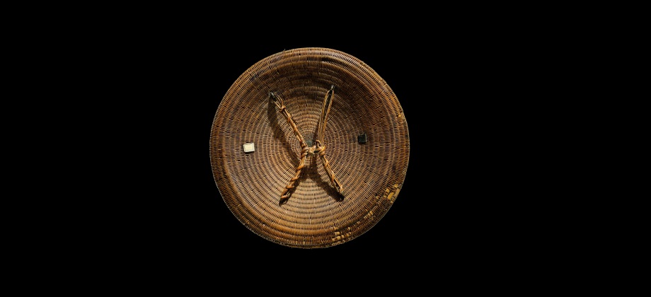 O povo Ache, da Sumatra Central, usavam este escudo, que também era conhecido na região por Peurise Awe. Este é um grande exemplar de 40,5 cm de diâmetro, quando comparado com os tamanhos mais vulgares, entre 32 e 38 cm. Ele é feito de cana enrolada em espiral, entrelaçada com "Rattan" (fibras de cana de bambú) e decorado com sete estrelas de seis pontas, em latão, vazadas e gravadas, seis à volta de uma central. Em boas condições, apenas com algumas falhas de "Rattan" no rebordo.
