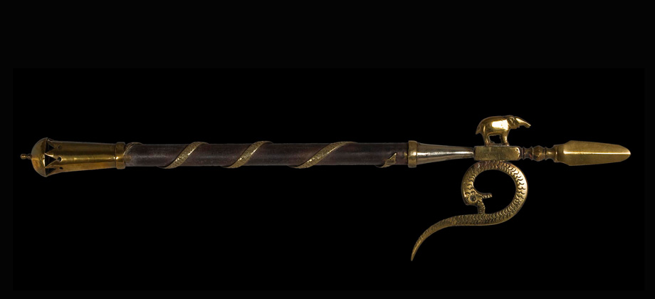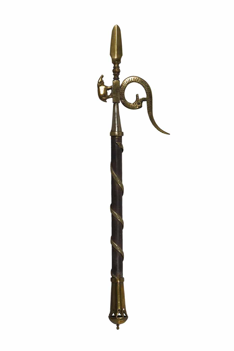 The tubular handle, made of iron, is decorated with a spiral ribbon made of brass, symbolising the body of a Naga. The pommel is made of the same metal, with a truncated conical shape opening at the base into sharp tips closed by a spherical cap.