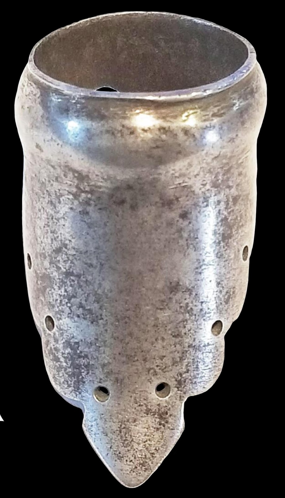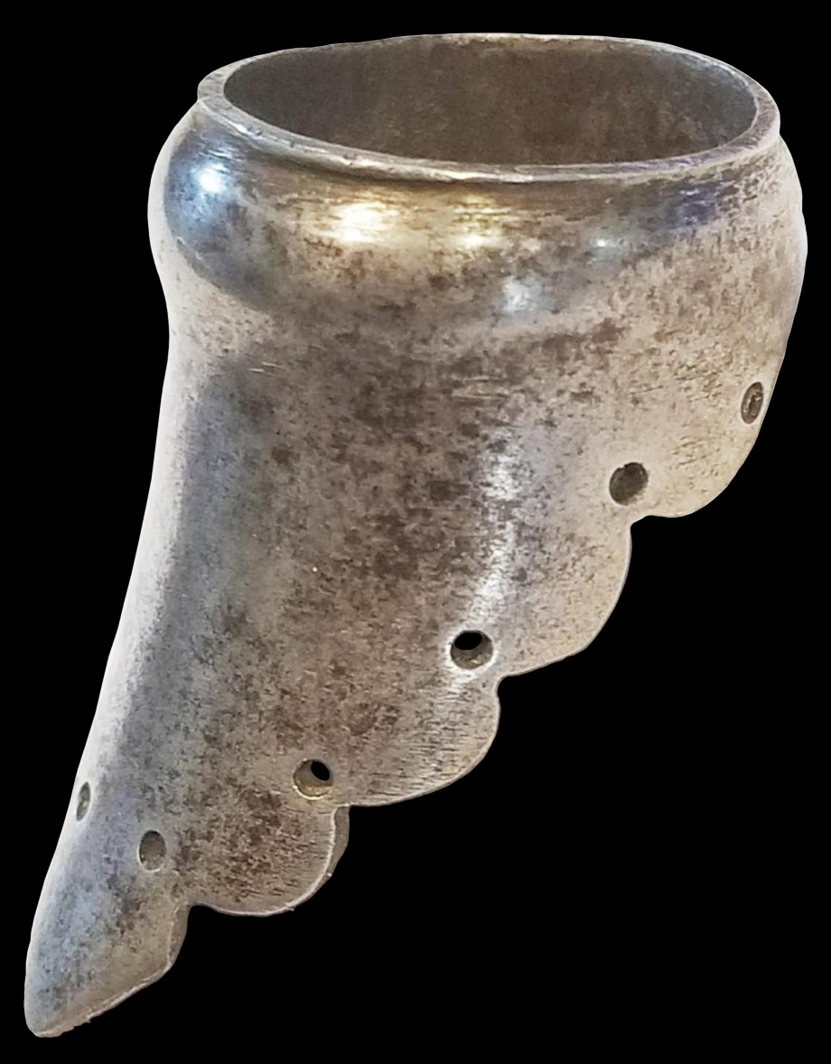 Anel de Archeiro em aço, exemplar de um formato muito raro com rebordo crenado e perfurado. Os orifícios seriam provavelmente para prender qualquer tipo de decoração, como pequenos sinos por exemplo.