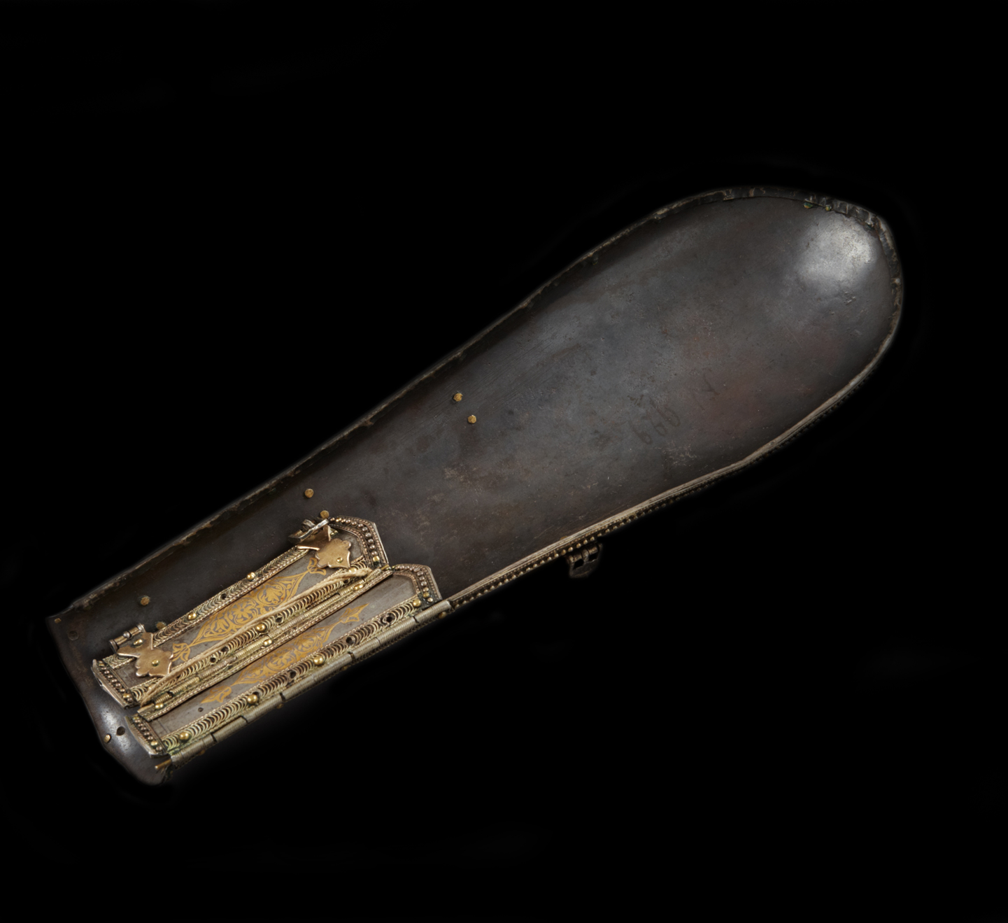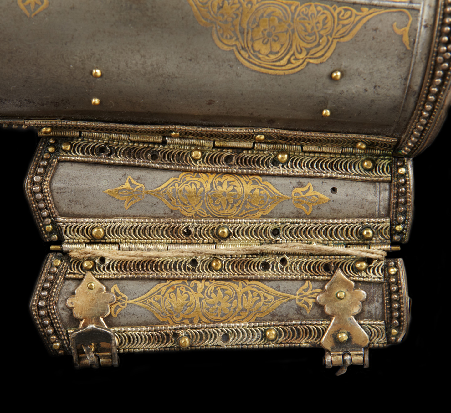 Bazu-Band, de origem indiana, provavelmente Rajastão, de altíssima qualidade, em aço ricamente trabalhado com arabescos Koftgari a ouro. O fecho do punho está completo, assim como as fivelas que o fecham.