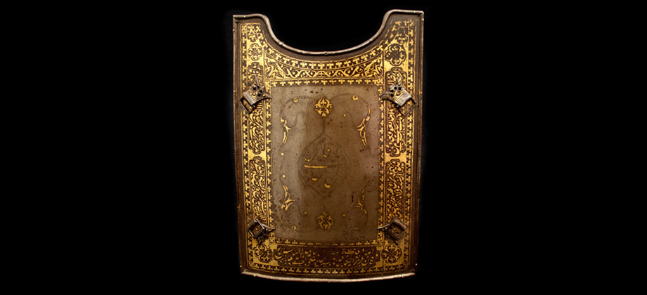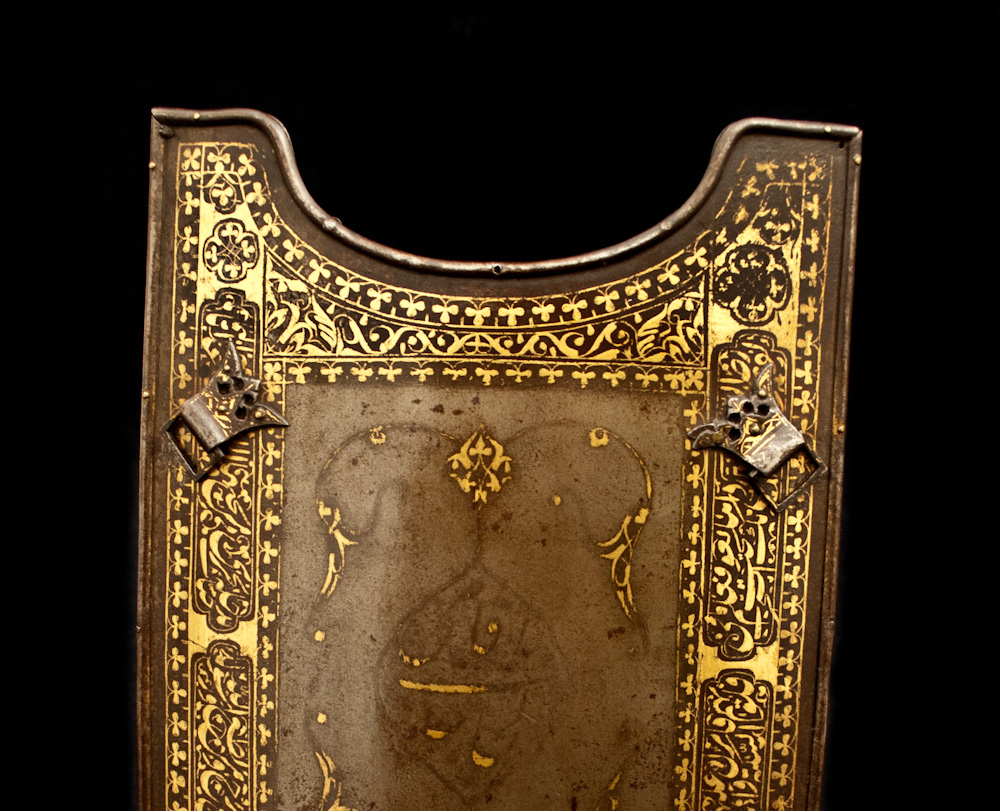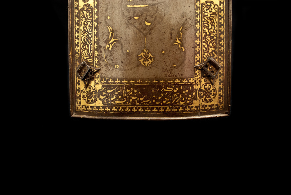 A Char Aina of unusually high quality, forged of wootz damascus steel with a faint gilt inscription at the center, the borders lavishly inlaid with pious inscriptions in gold. Retains its original fretted and gold-inlaid buckles.