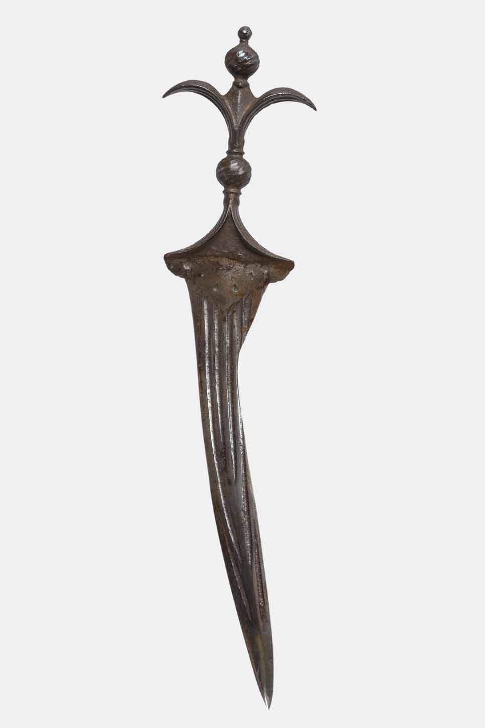 This piece, cast in iron, is a good example of this sort of dagger. The blade is wide and flame shaped, with a double edge, strongly ribbed with the corrugations displayed in a parallel pattern. It shows wear from heavy use, through several generations.