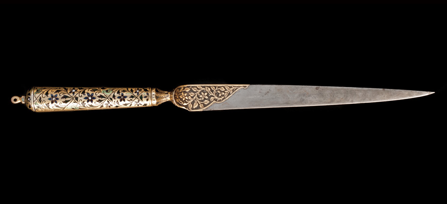 Adaga com punho de esmalte dourado, com lâmina de aço damasquinado.