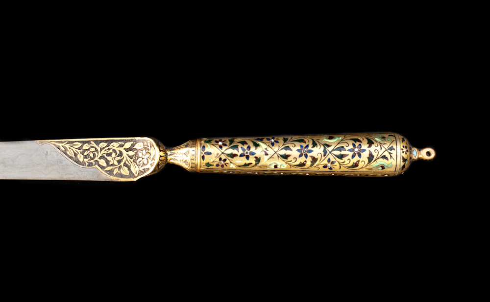 The hilt, with its motifs done in the minakari (enamelling) technique are characteristic of the Lucknow style, in Northern India.