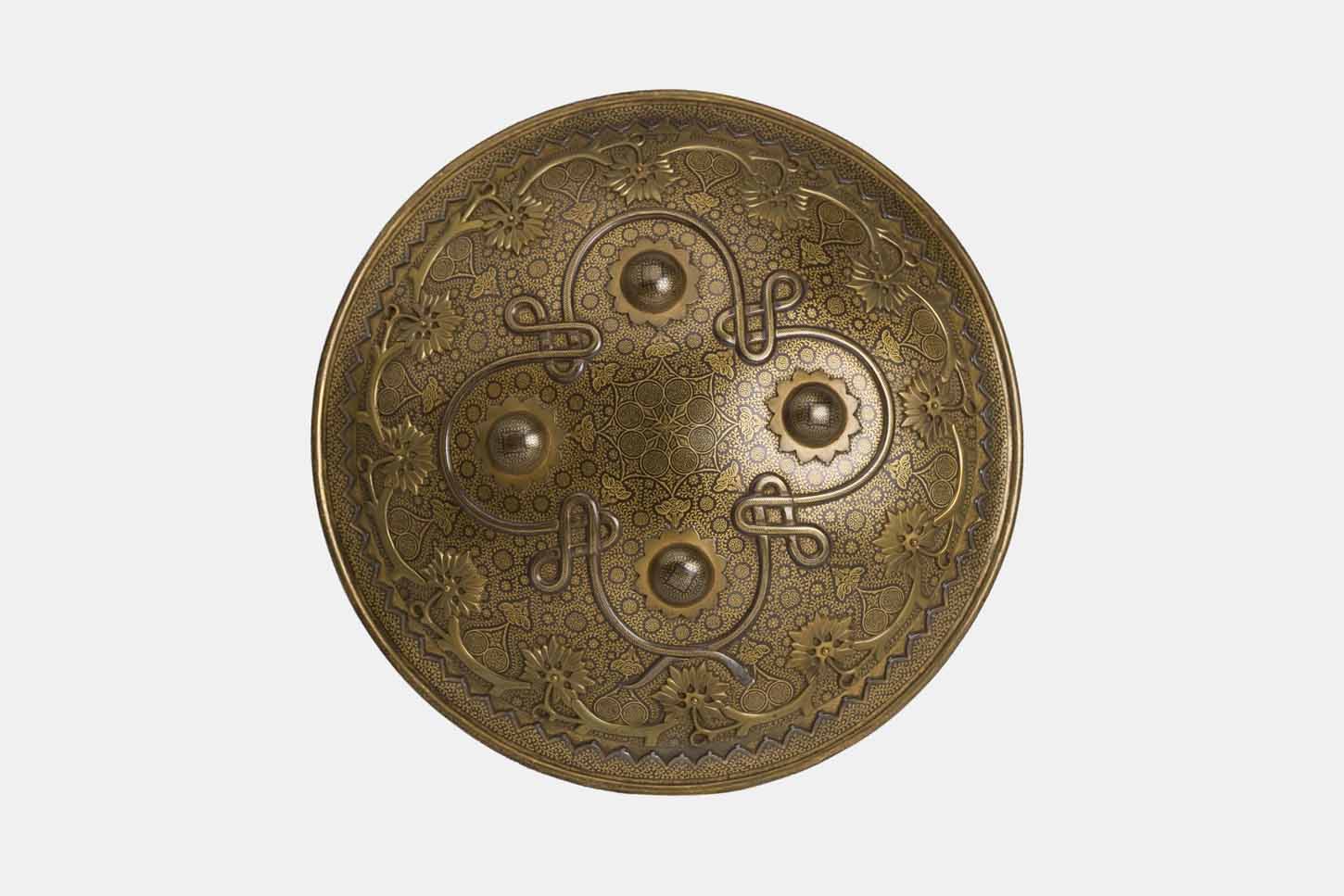 This circular shaped shield, made in steel, has its surface completely covered in a repetitive floral pattern, engraved in bass relief, and inlayed in gold. Over this pattern and at the centre, it displays a serpent forming, with its body, four large knots alternating with four petals as it circles the corresponding number of protuberances of the shield