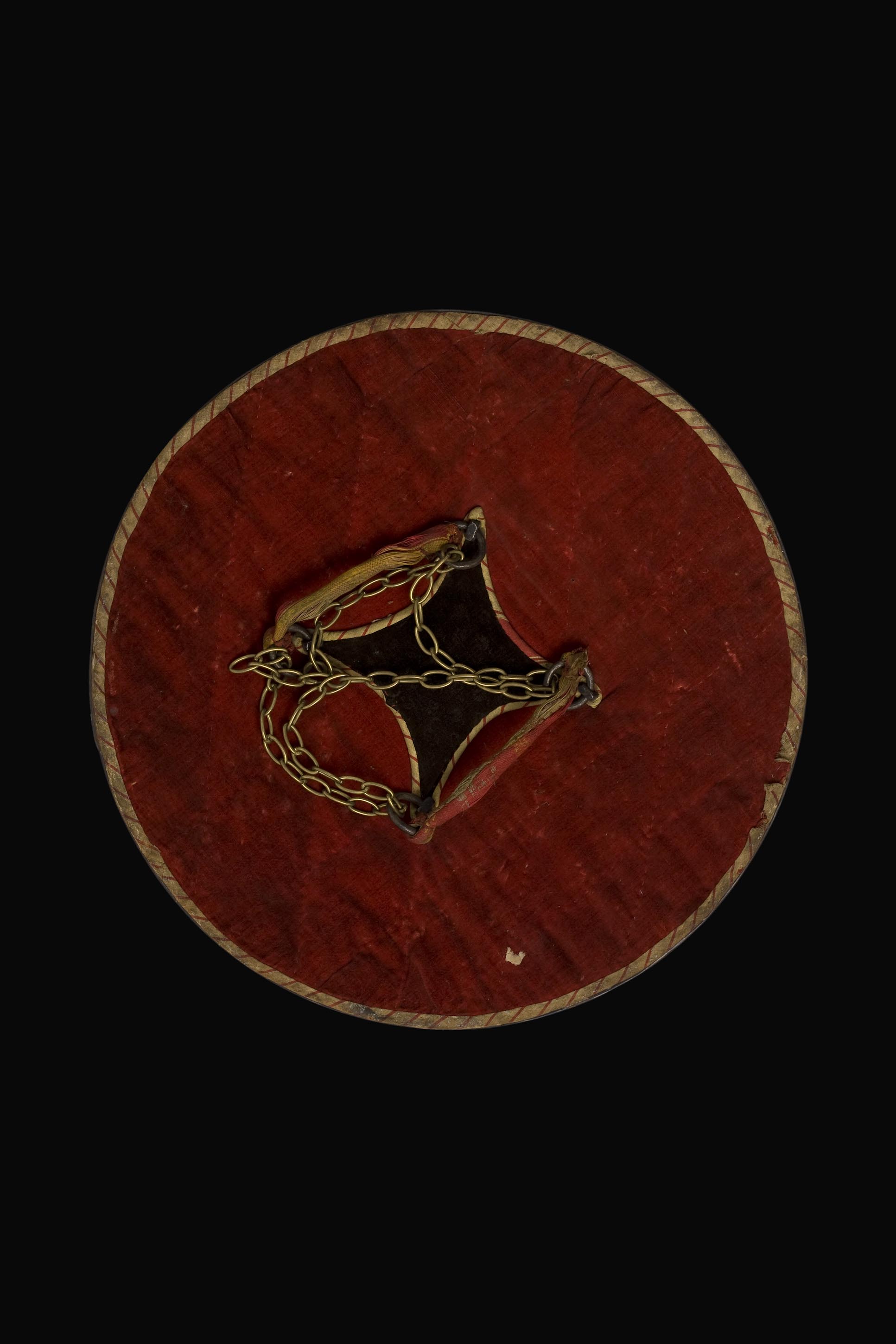 The reverse of the shield preserves in good condition the original lining, in red velvet, along with its respective sustaining chains.