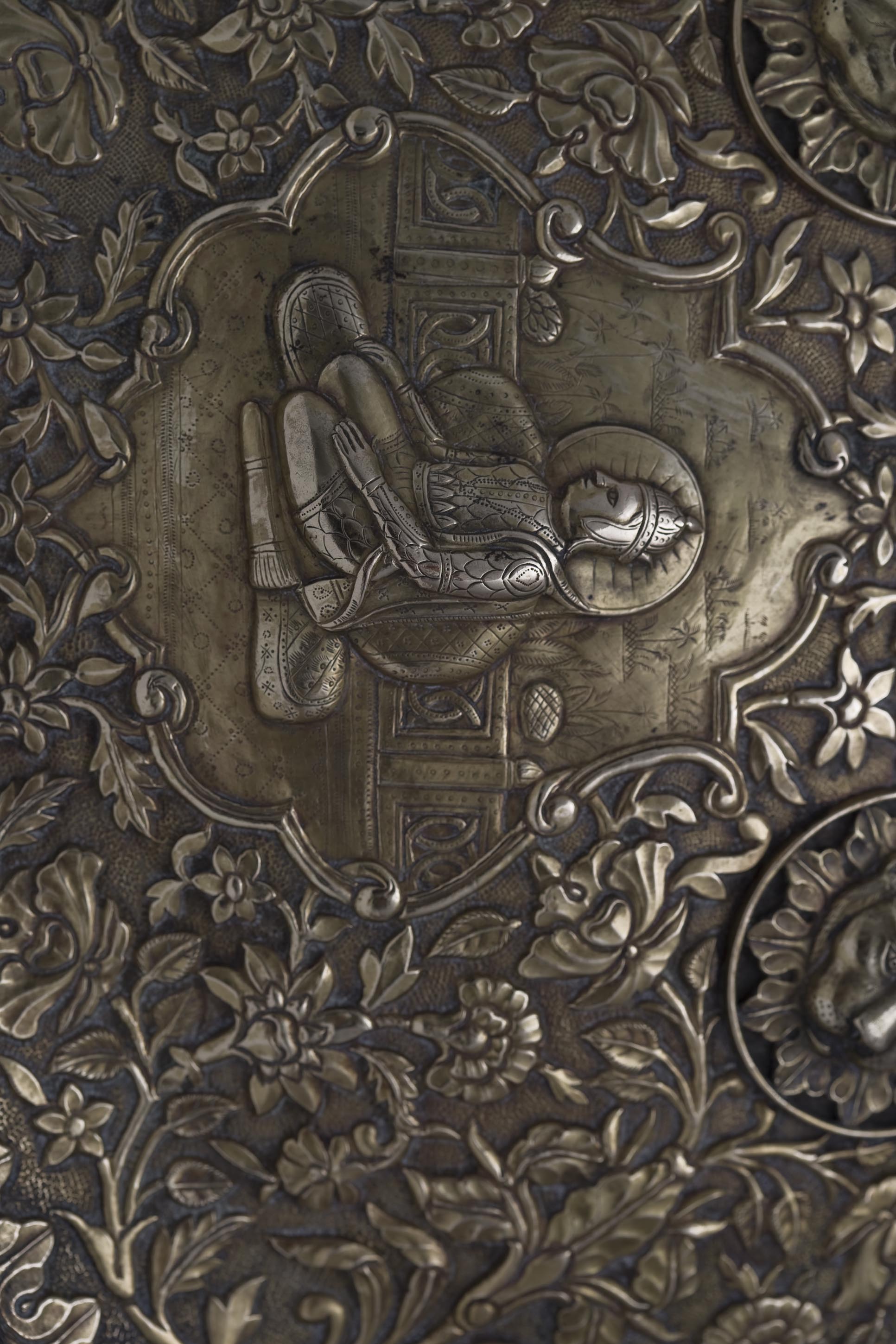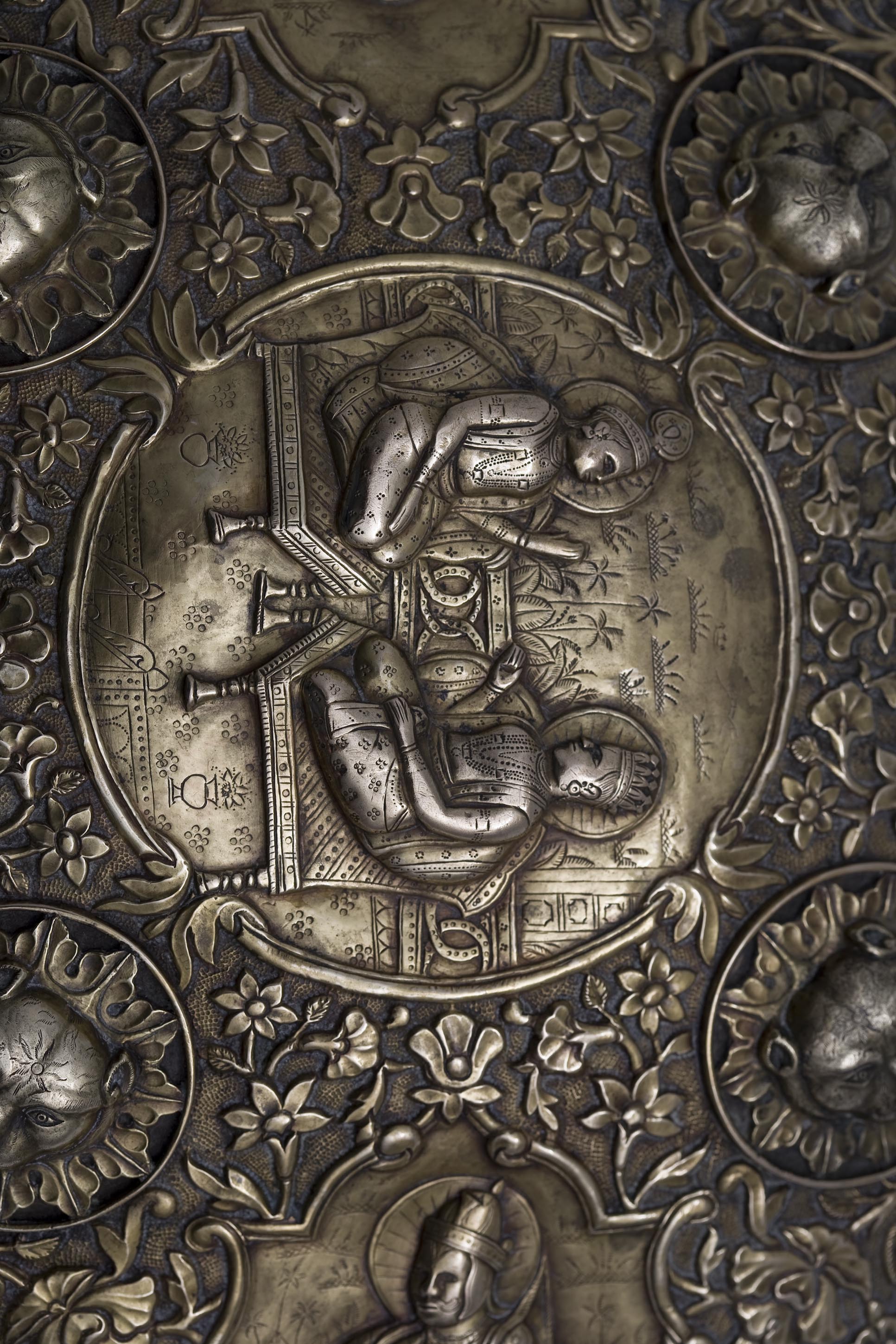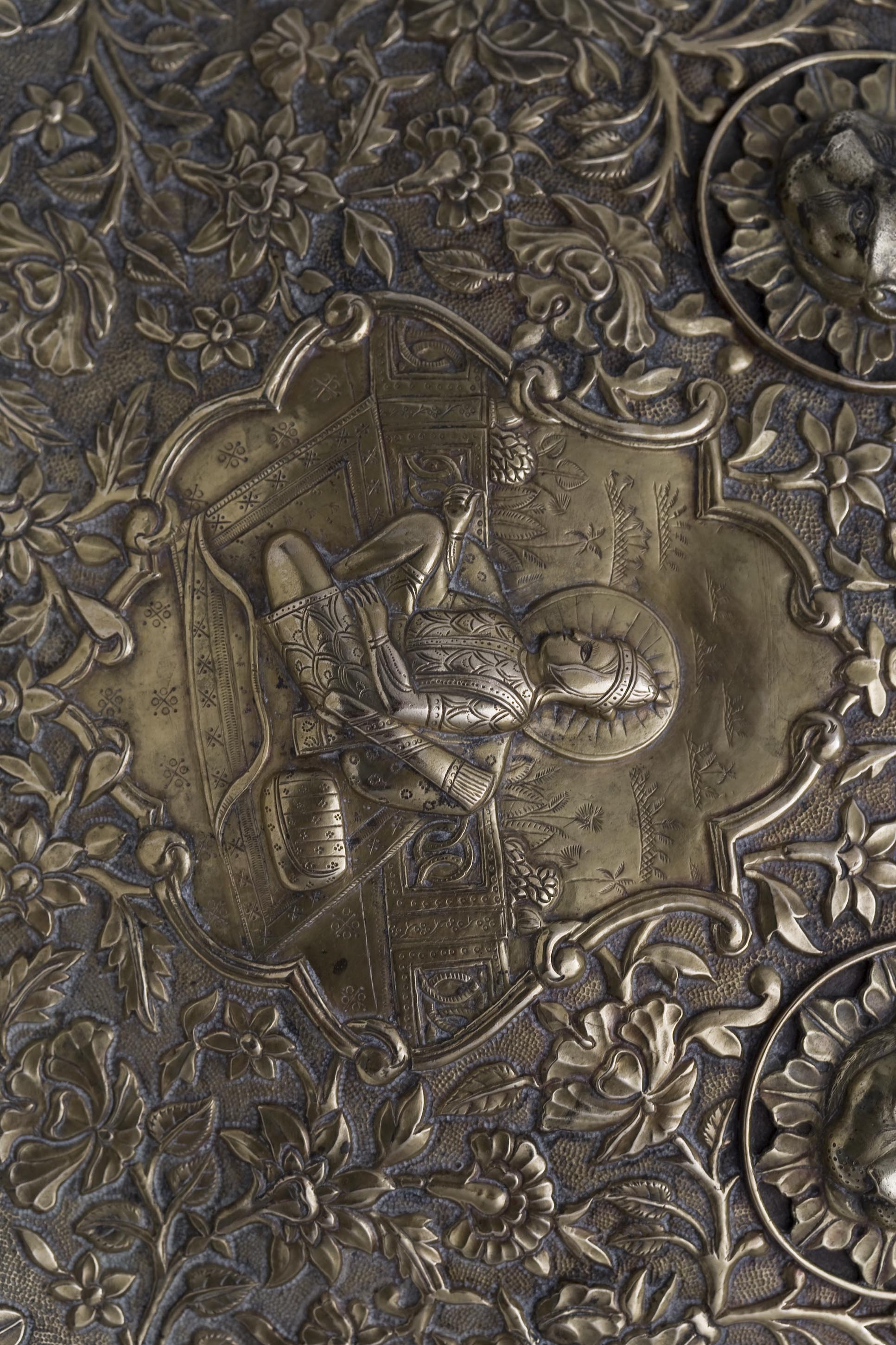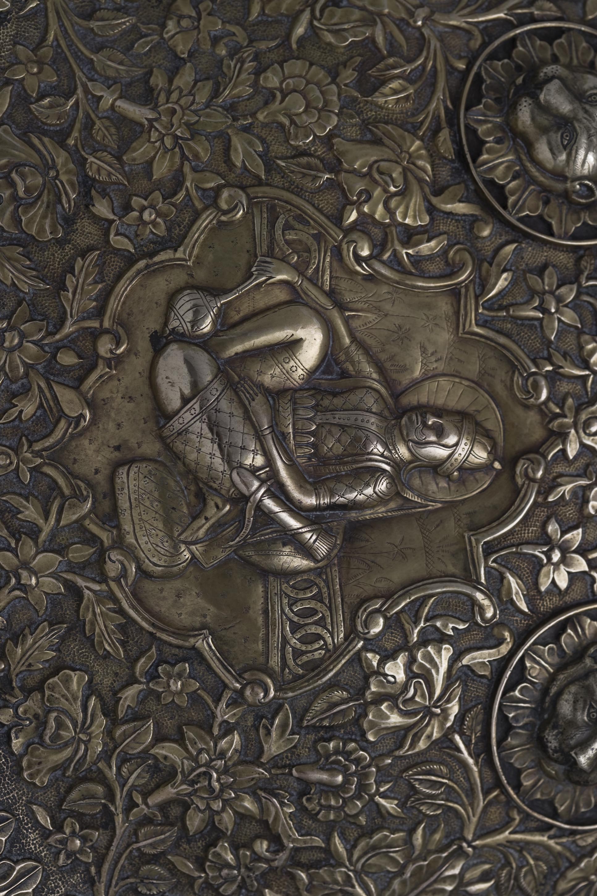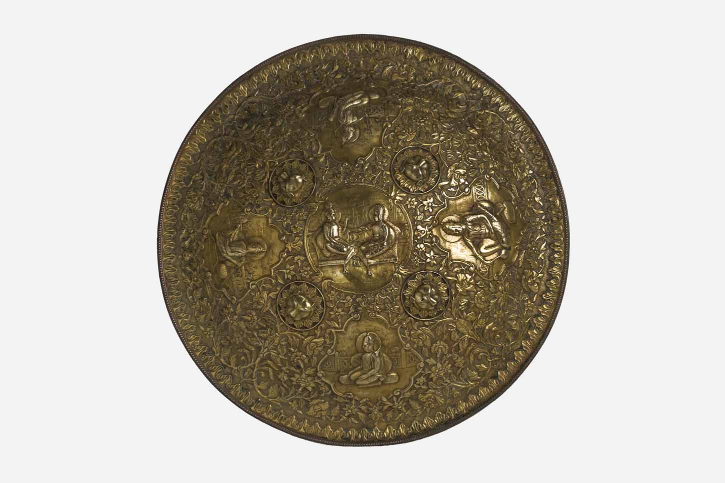 This Dhal is in copper, in a vaulted circular shape, and displays a notable work of high relief chiselling, a decoration arranged from a central medallion where a noble couple is portrayed, sitting front to front.