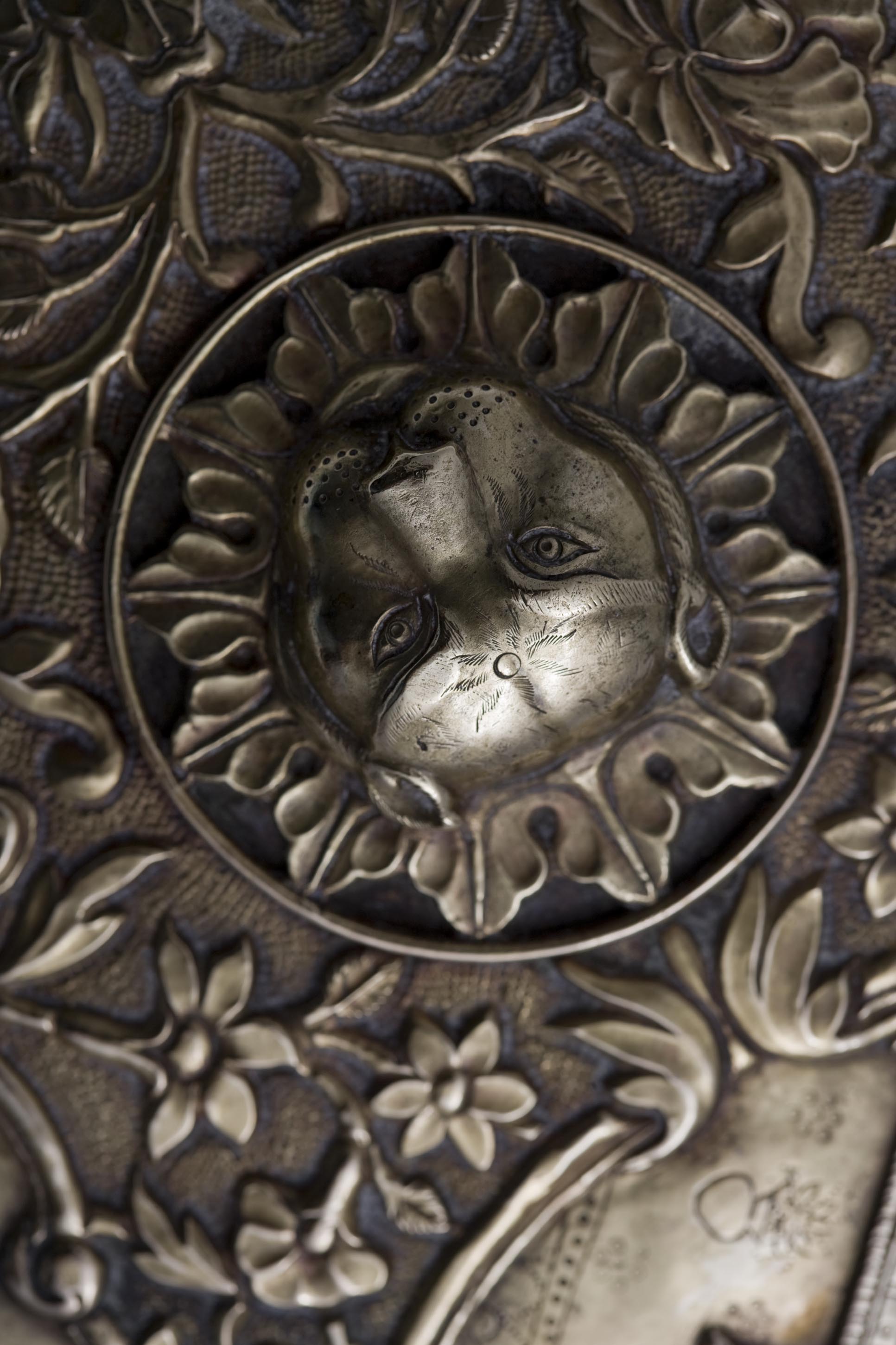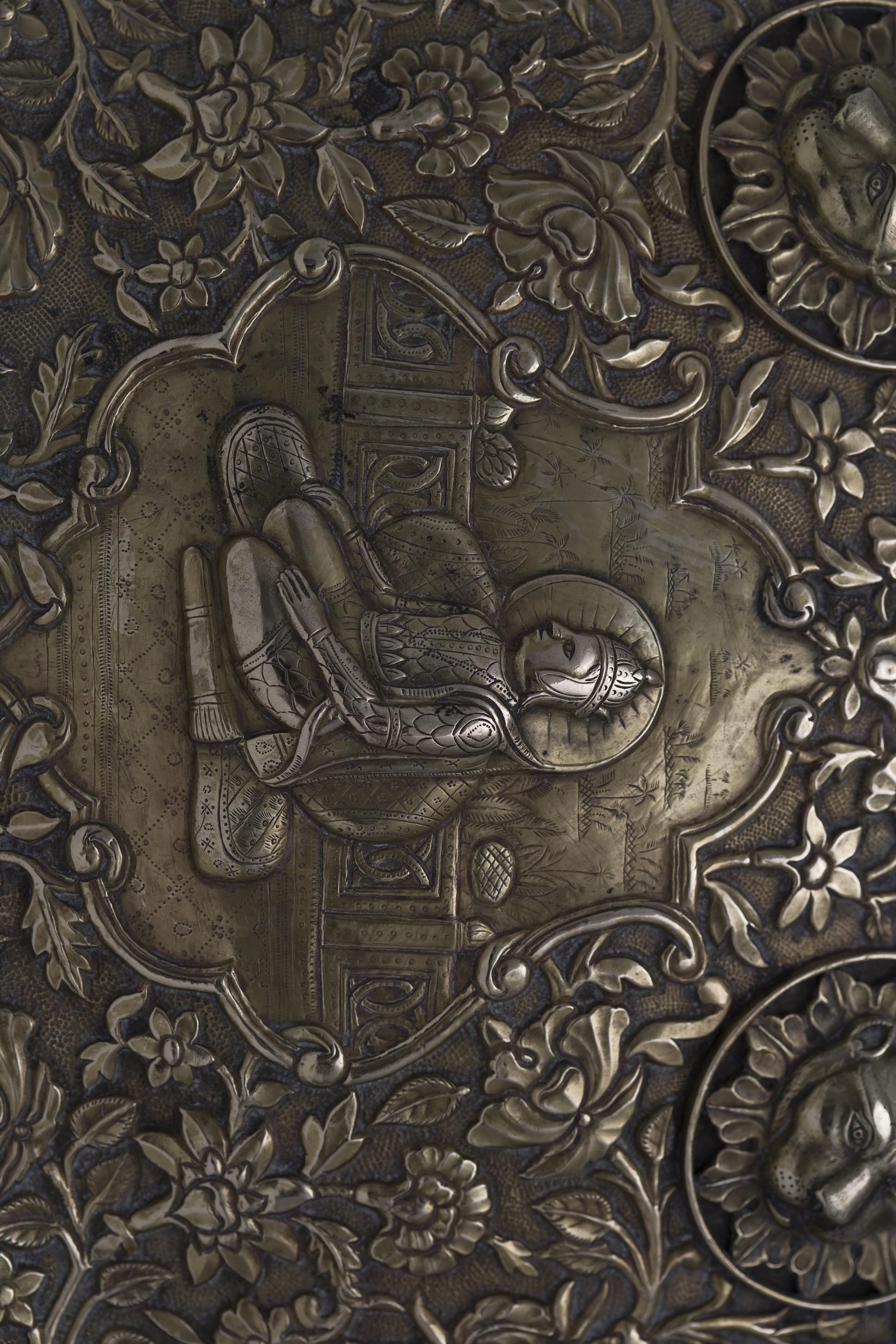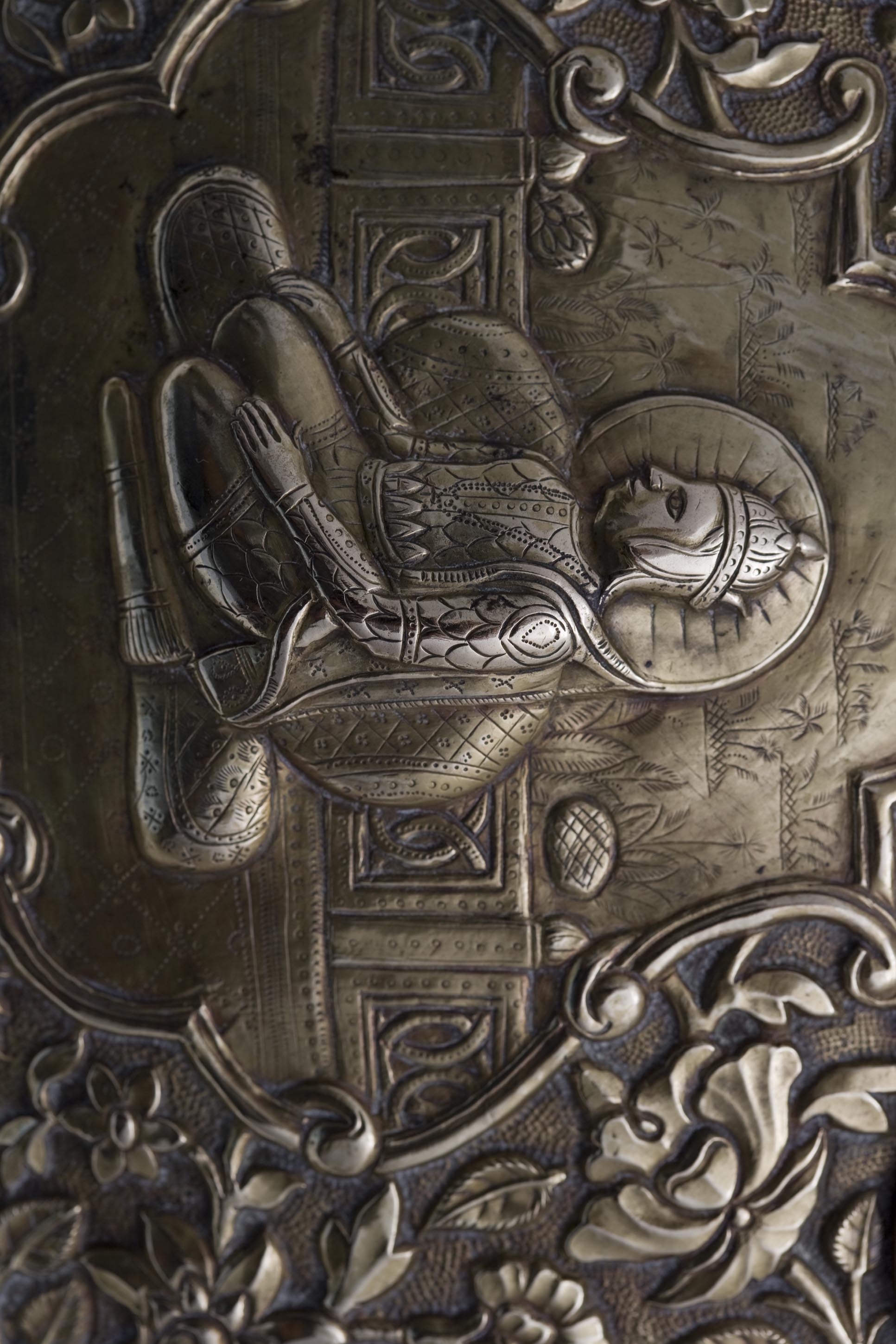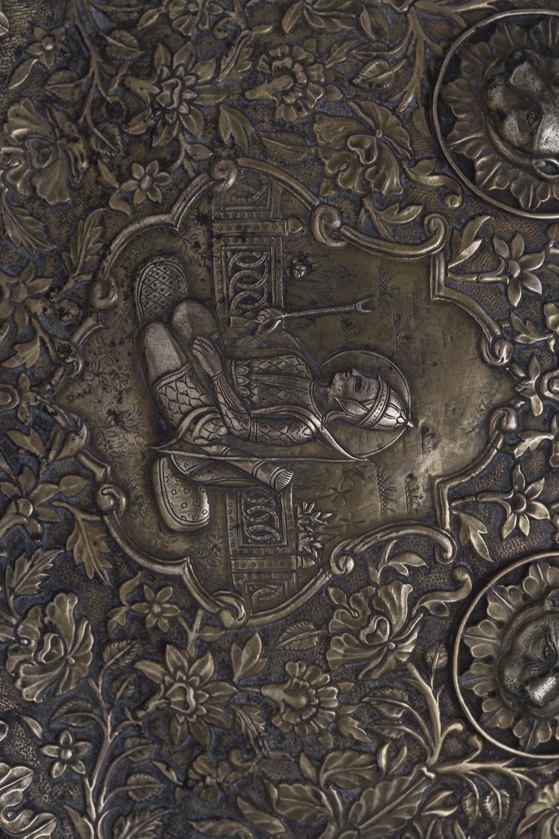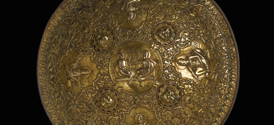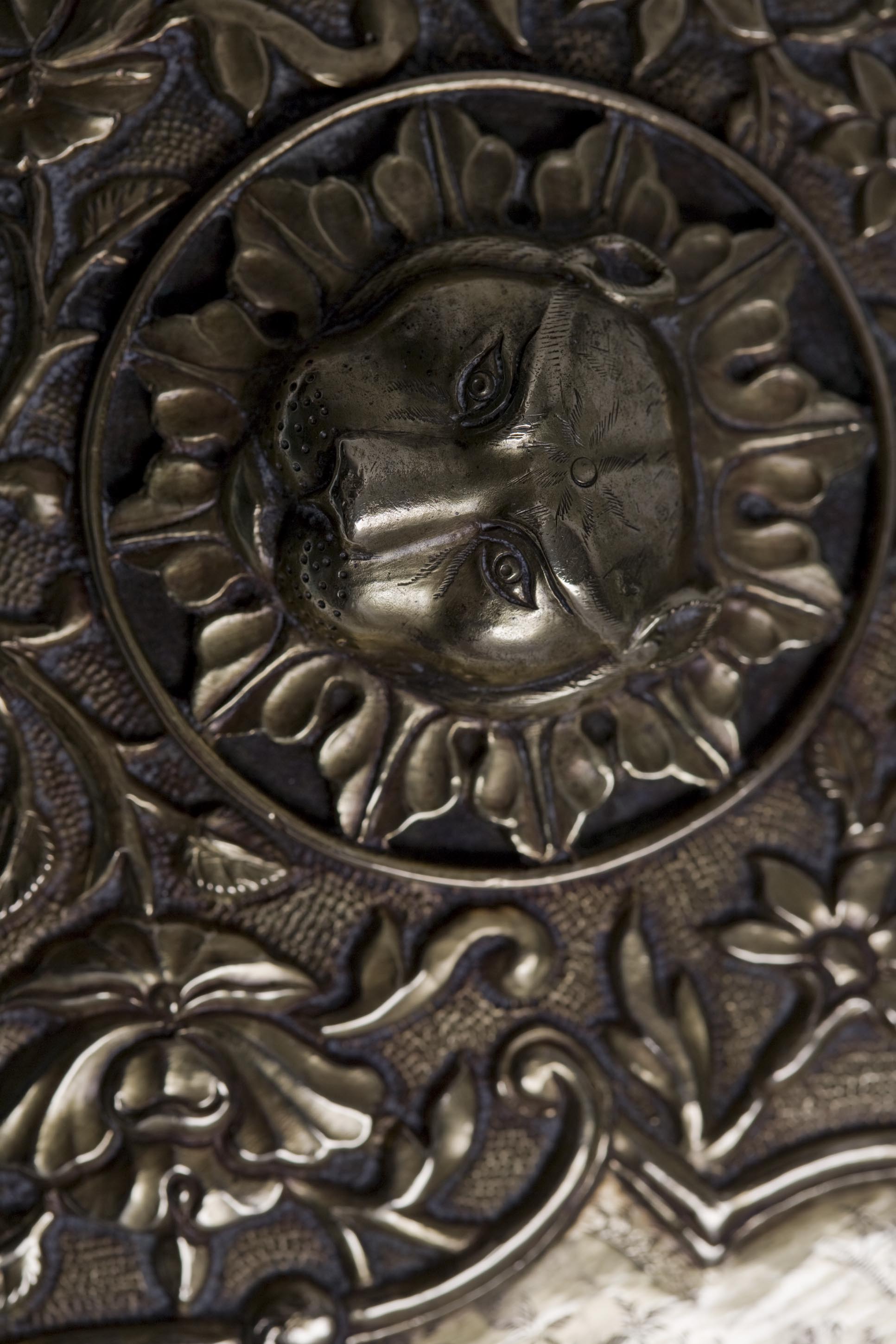 This Dhal is in copper, in a vaulted circular shape, and displays a notable work of high relief chiselling, a decoration arranged from a central medallion where a noble couple is portrayed, sitting front to front.