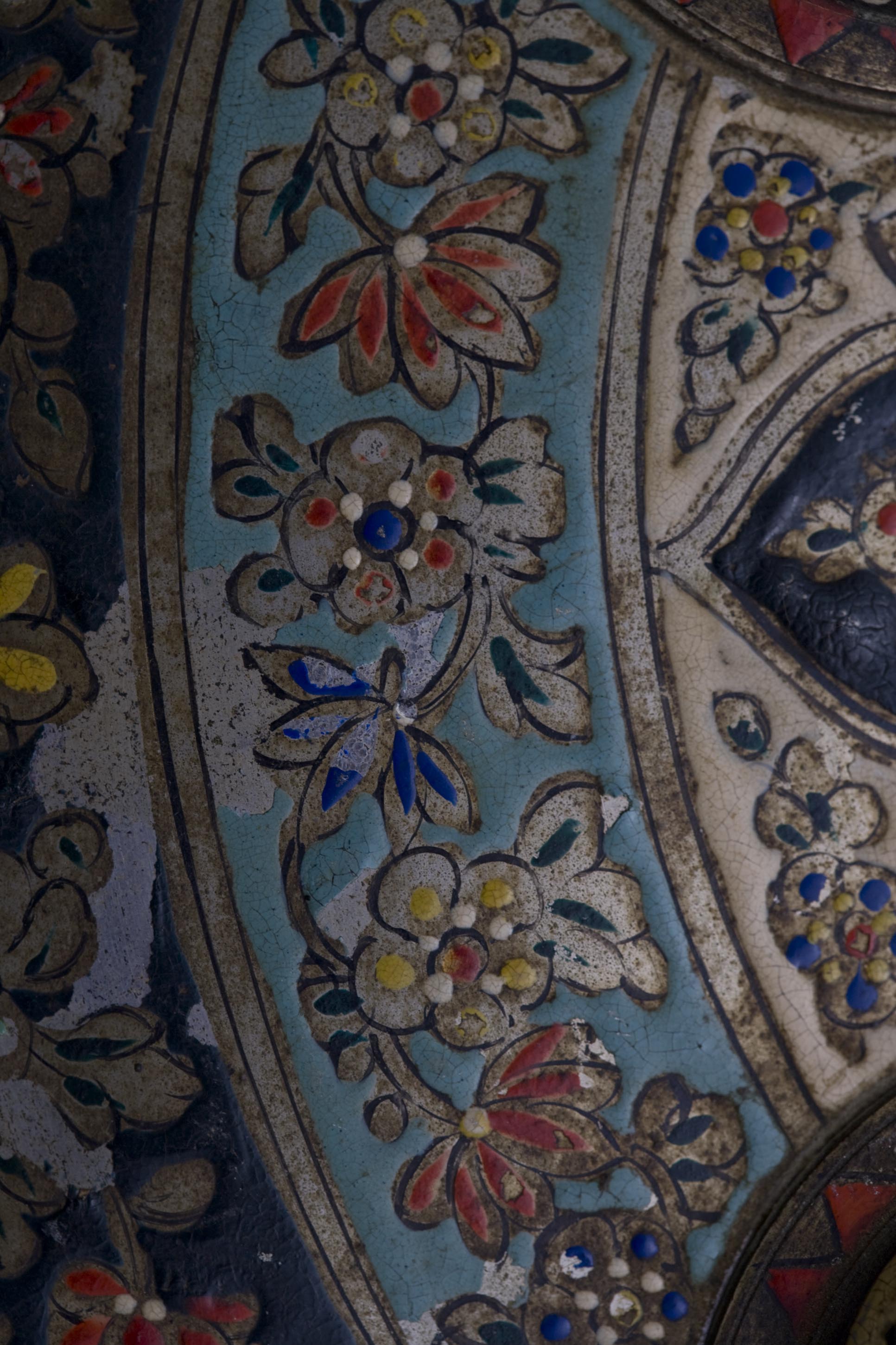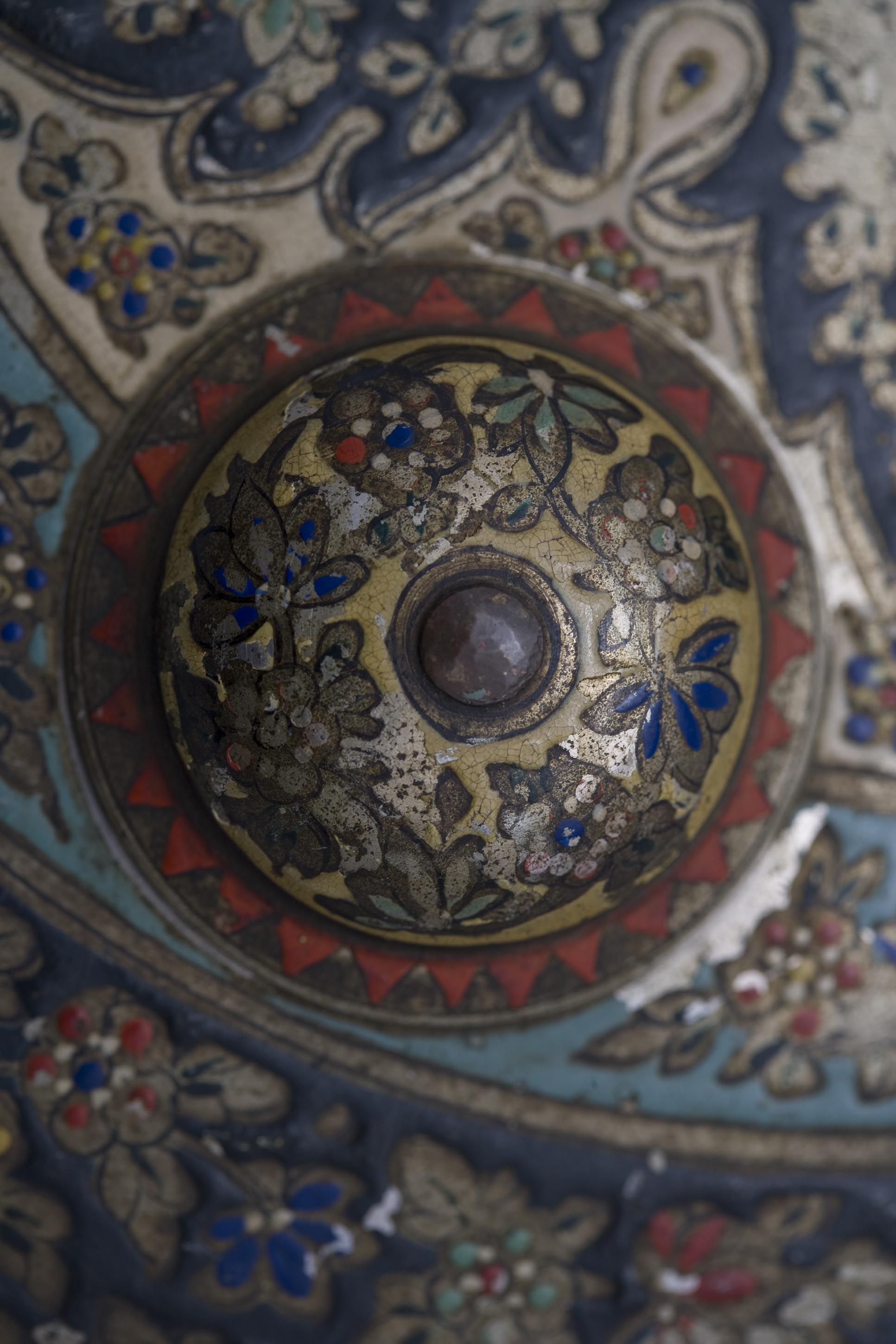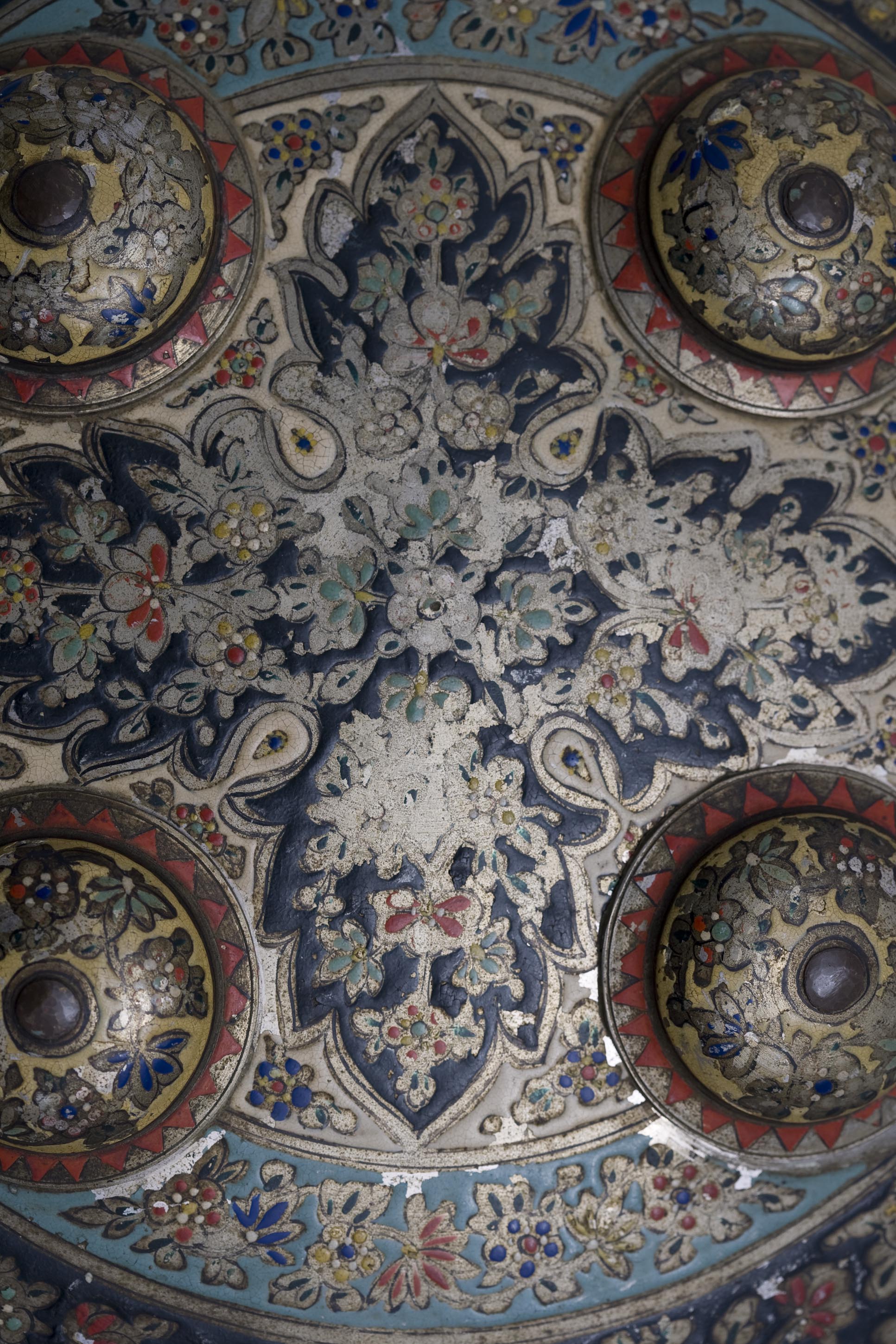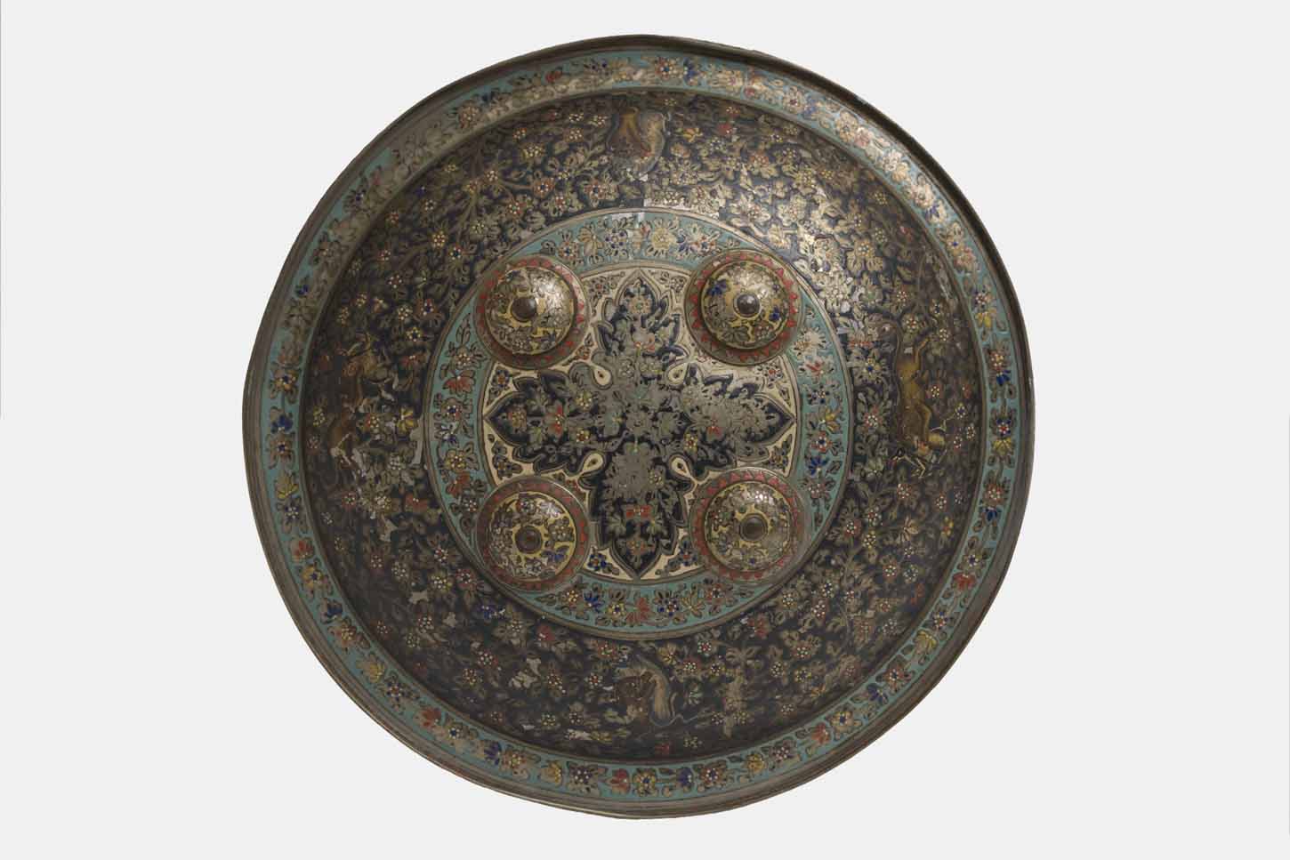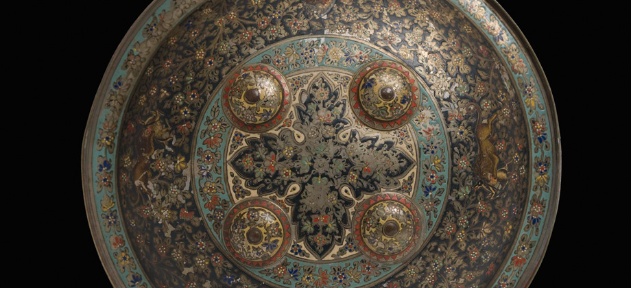 Circular shield of Indian origin, in copper, painted and enamelled. The decoration of this piece is arranged in concentric bands, from the central finial.