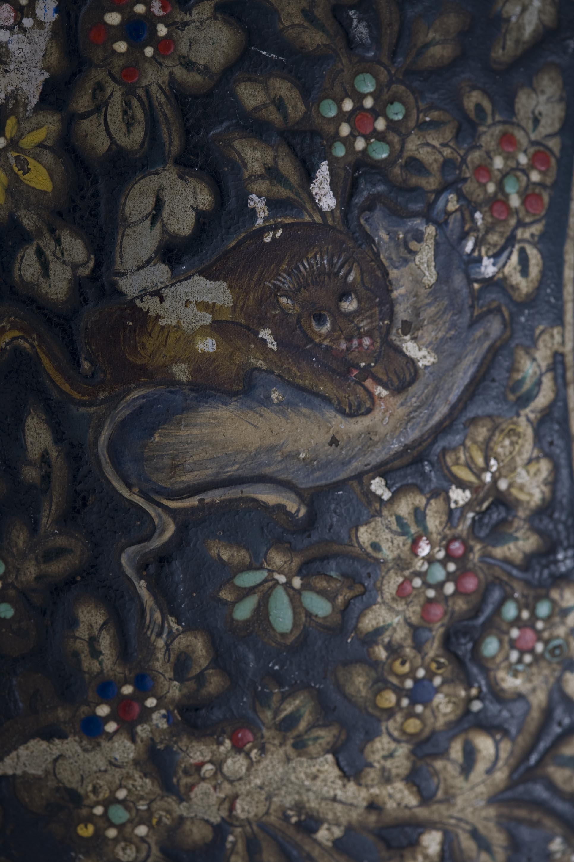 A smooth freeze separates it from the exterior band, which displays several lions while hunting, holding prey with their claws, surround by thick foliage.