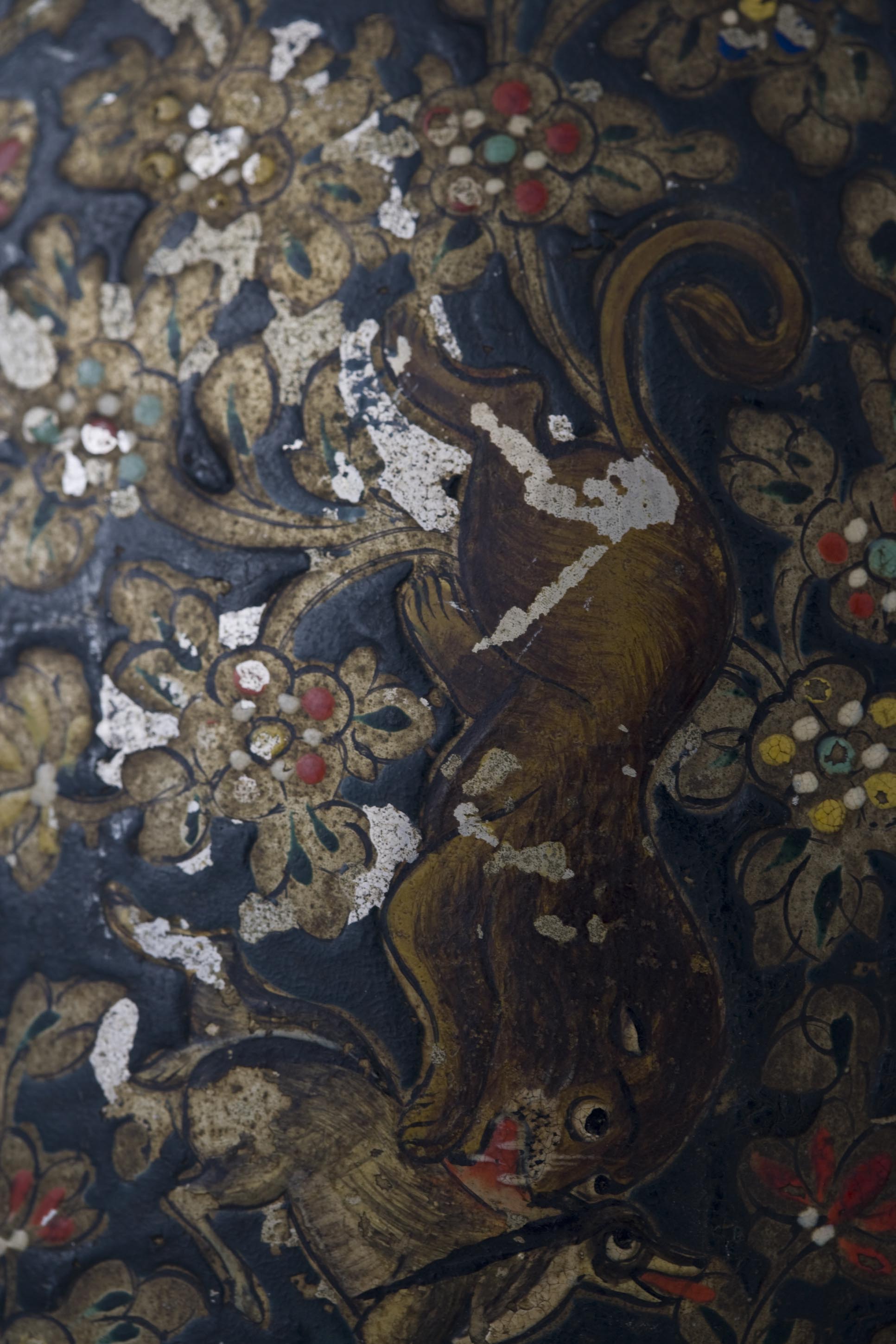 Escudo circular de origem indiana, em cobre, pintado e esmaltado. A decoração deste exemplar, organiza-se em faixas concêntricas, a partir de um florão central. A faixa interior, desenvolve um padrão contínuo de temática vegetalista e floral. Um friso liso, separa-a da faixa exterior, onde estão representados vários leões em pleno acto de caçar, segurando com as garras as presas, no meio de profusa e densa vegetação.