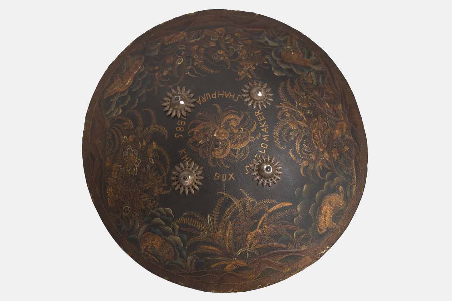 In the exterior side and at the centre, surrounding the four iron protrusions of the star shaped eyelets which hold the straps, an inscription is visible, which reads Khuda Bux shieldmaker shapura 1885 “Khuda Bux maker of the shield 1885”.