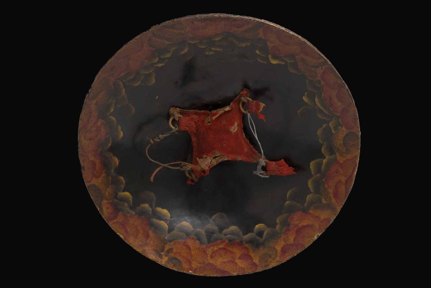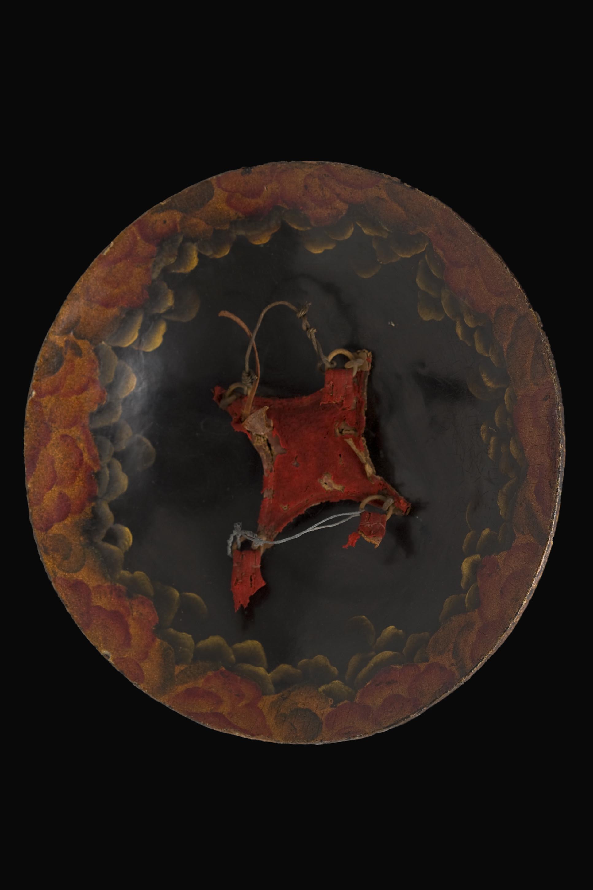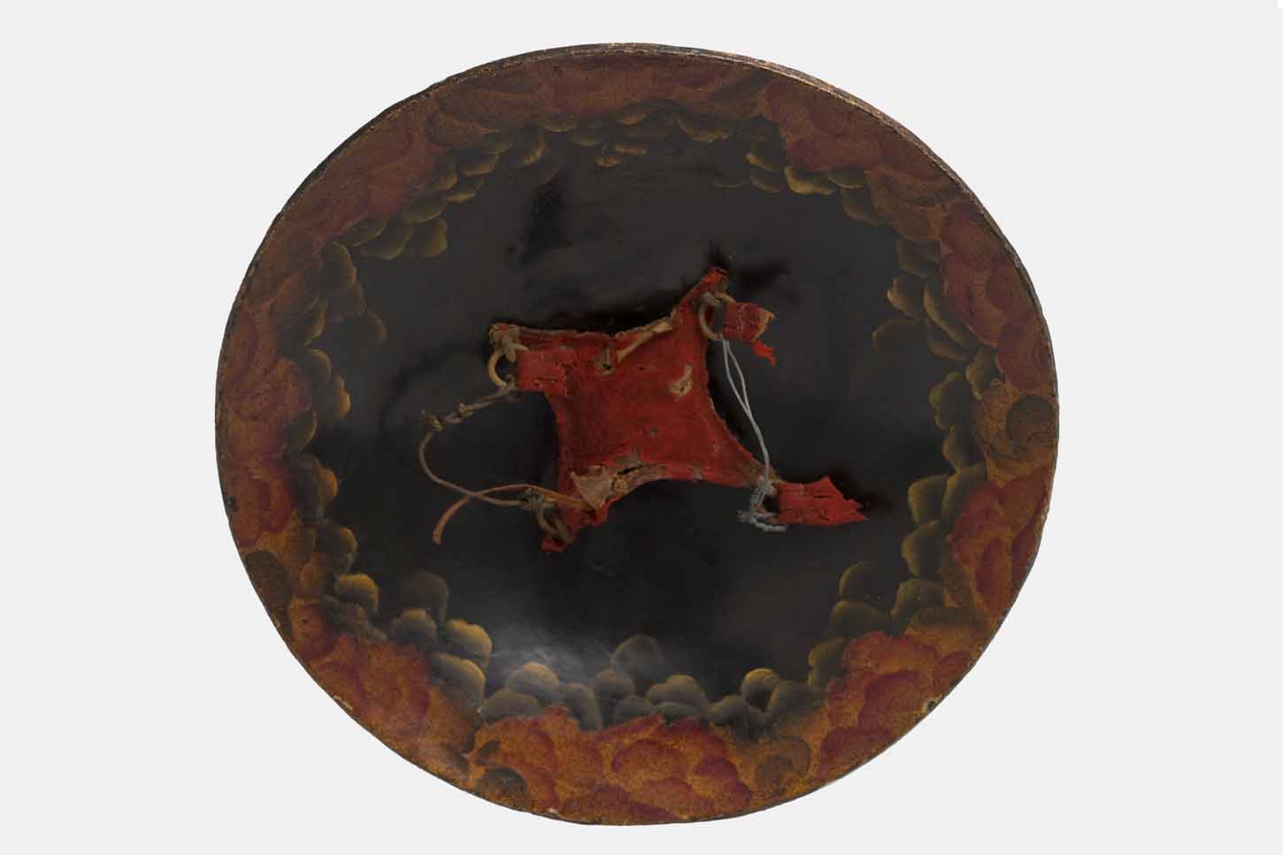 This Dhal, of a slightly domed circular shape is made of rhinoceros leather, which was dried, not tanned, and lacquered.