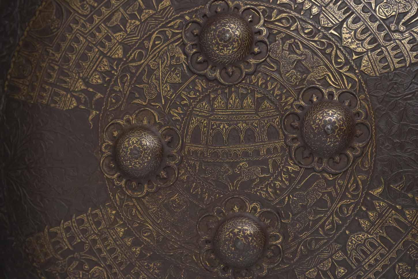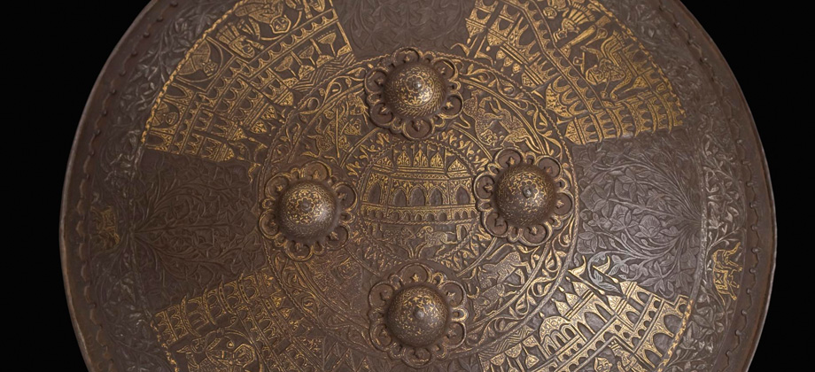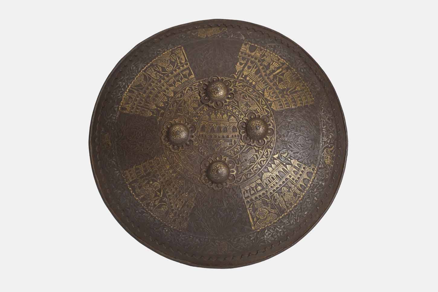 This Dhal, made of iron, of a circular shape and with its characteristic four protrusions, displays a deep chiselling with gold and silver inlays in the koftgary technique, covering its entire surface. The decorative theme is displayed in concentric bands. In the central area, the Dakshineswer Temple, built in 1885 and dedicated to the goddess Kali is shown. In the rest of the bands, intercalated with arabesques, are displayed scenes with hunting animals and several representations of the goddess in blood sacrifices, surrounded by thick foliage. The edge displays a relief decoration in the shape of saw teeth.