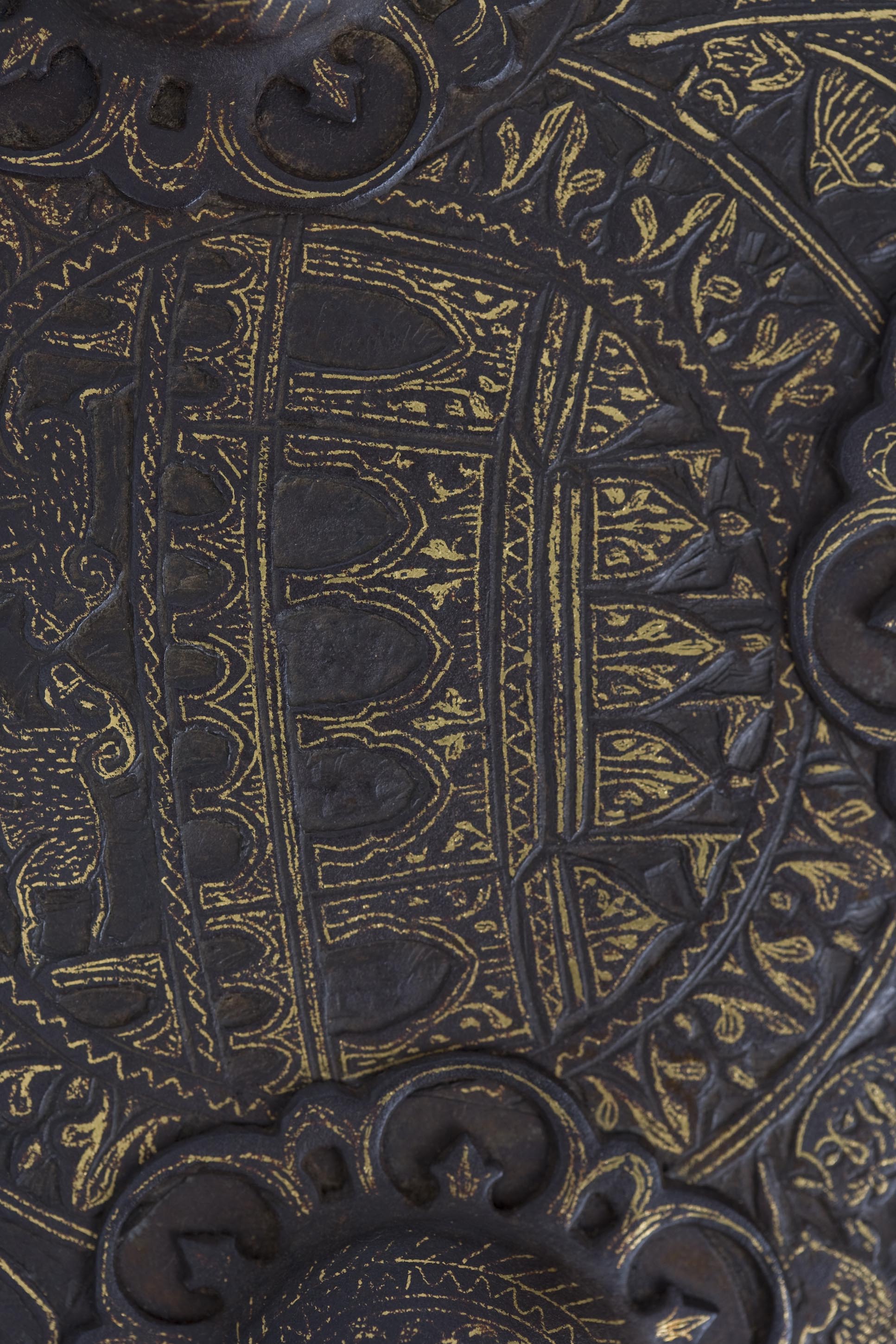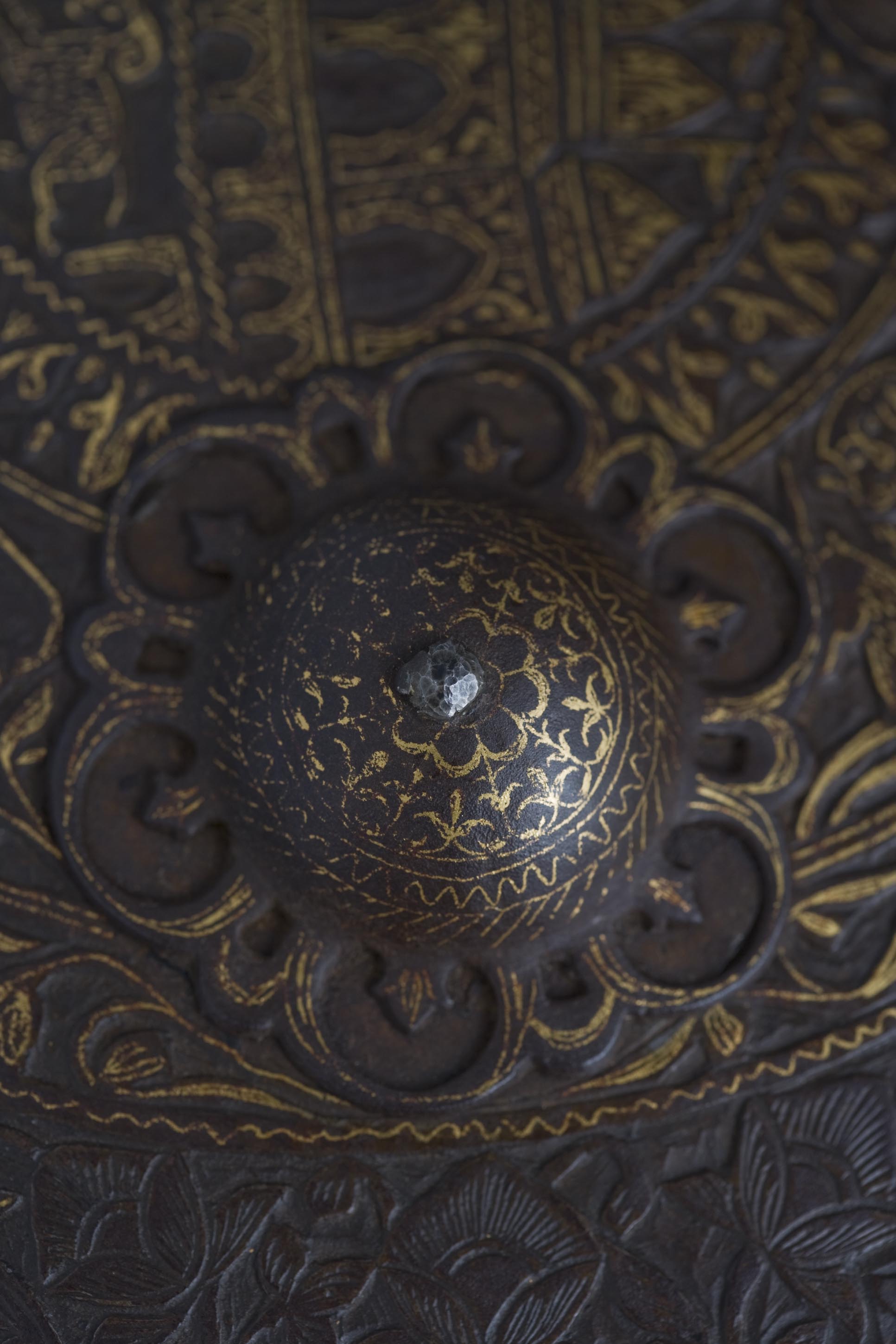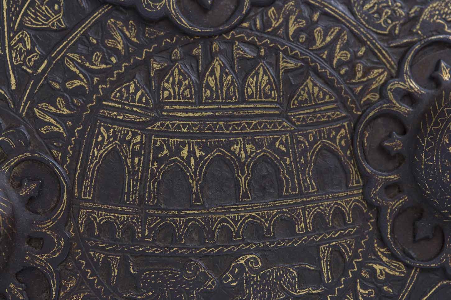 This Dhal, made of iron, of a circular shape and with its characteristic four protrusions, displays a deep chiselling with gold and silver inlays in the koftgary technique, covering its entire surface. The decorative theme is displayed in concentric bands. In the central area, the Dakshineswer Temple, built in 1885 and dedicated to the goddess Kali is shown. In the rest of the bands, intercalated with arabesques, are displayed scenes with hunting animals and several representations of the goddess in blood sacrifices, surrounded by thick foliage. The edge displays a relief decoration in the shape of saw teeth.