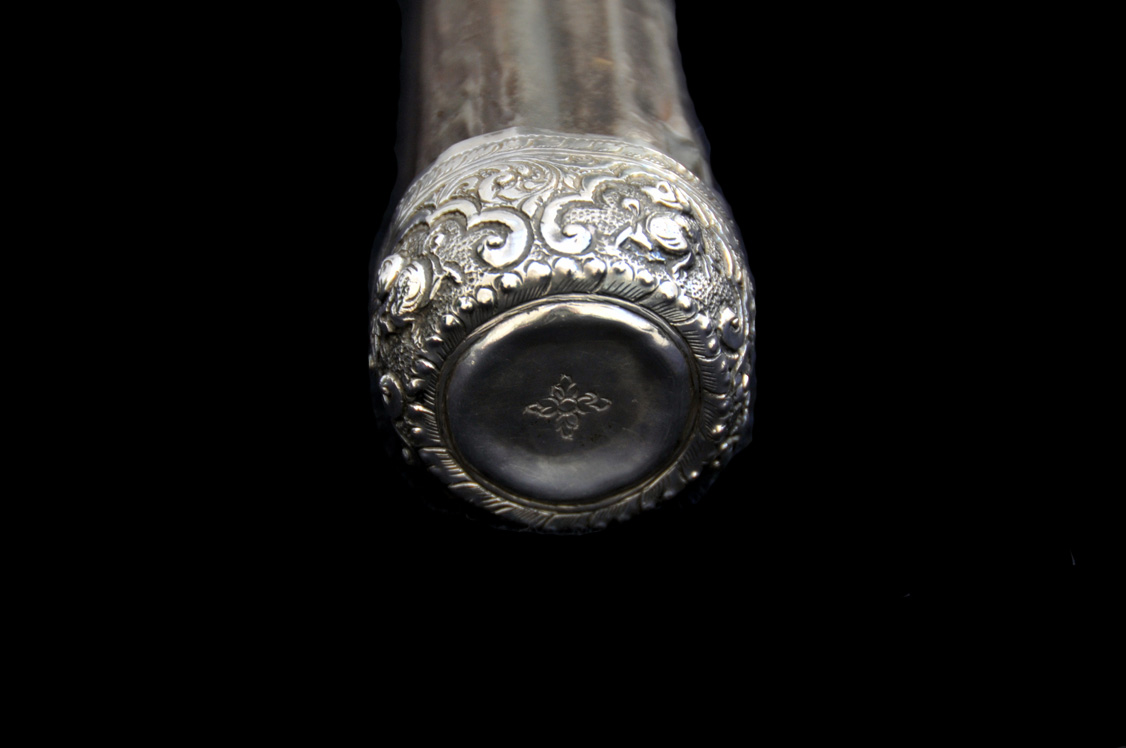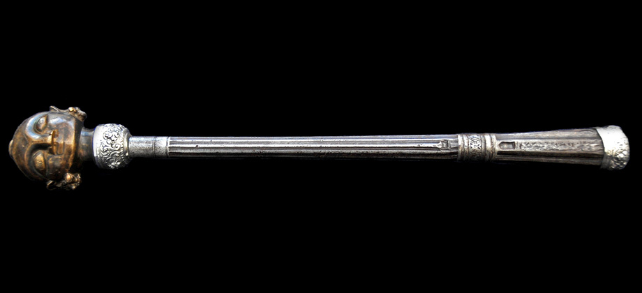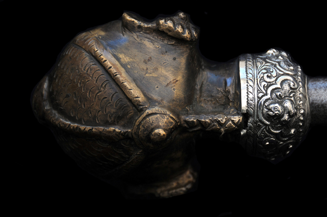 Uma maça Indiana fora do comum. Este exemplo têm uma cabeça de latão finamente fundida com uma bela patina, e parece ter sido construída a partir do cano de uma carabina, re-utilizado como um punho comprido e pesado. O pomo e a virola são feitos de prata finamente cinzelada.