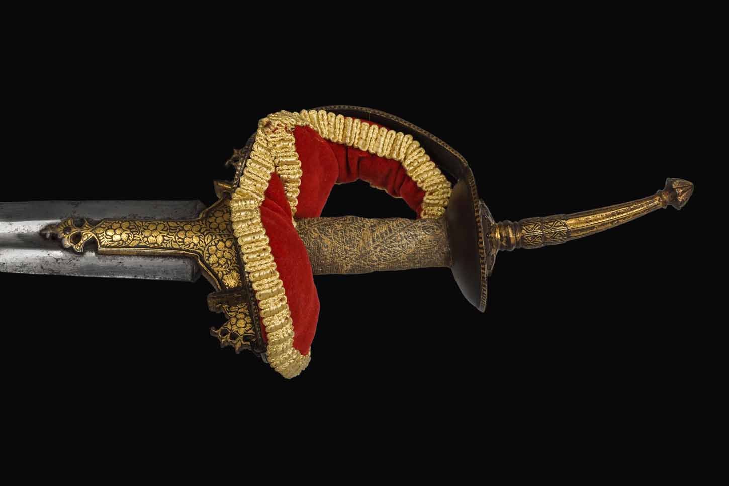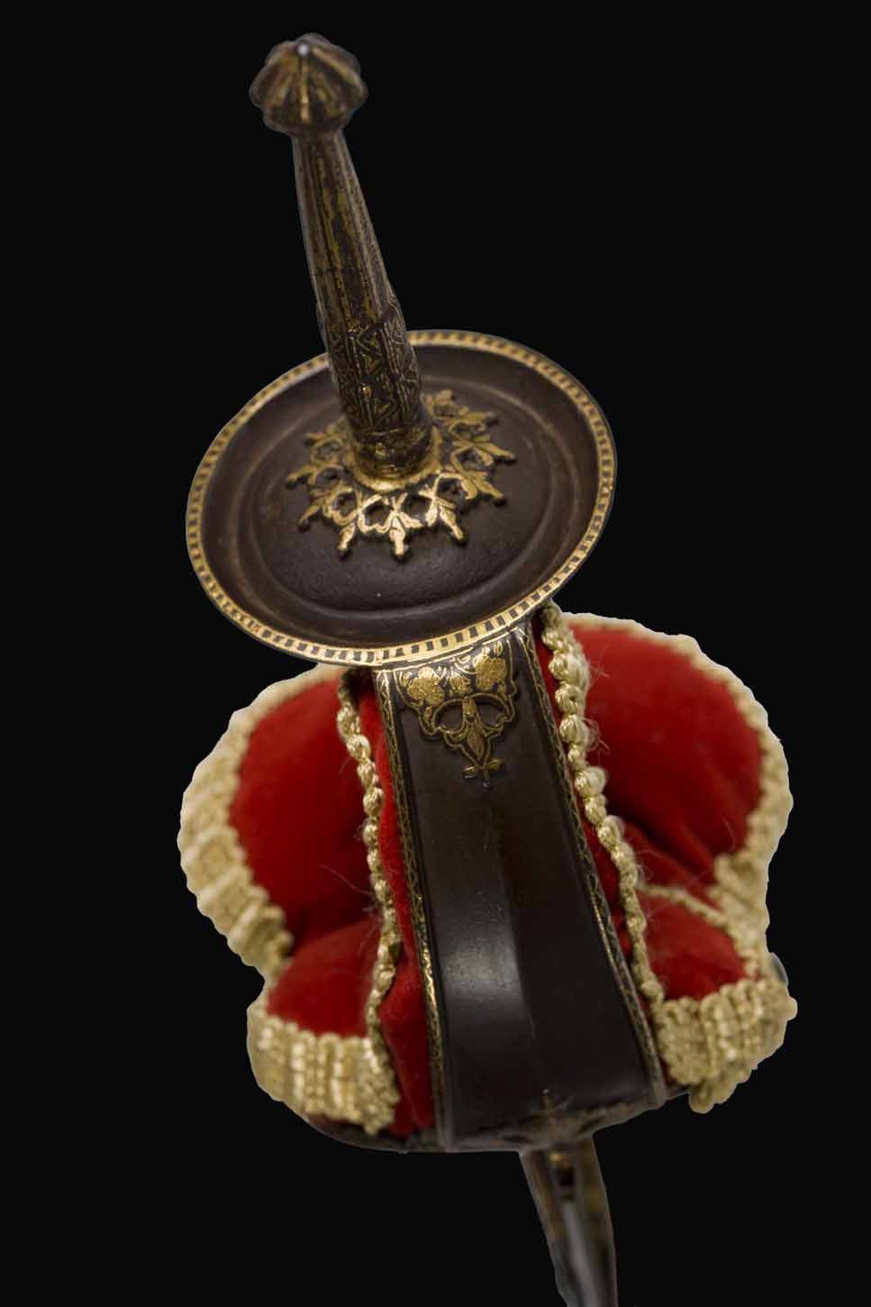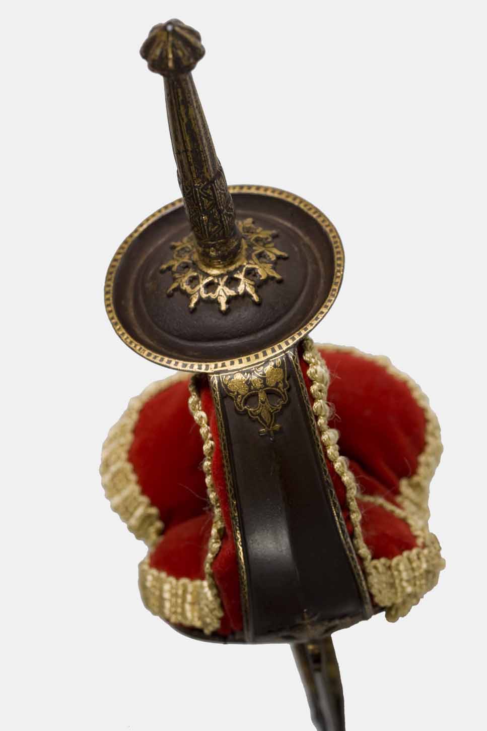 A respectiva bainha é de madeira, revestida a veludo vermelho, contendo ponteira de aço damasquino com decoração “en suite”.