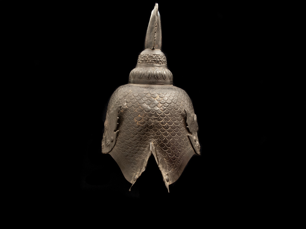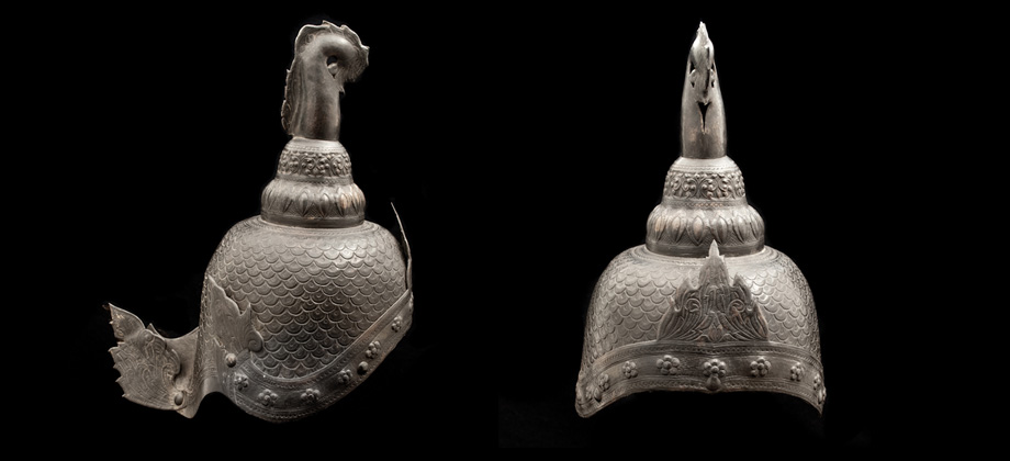 Exceptional Tibetan helm in bronze, decorated with chiselled scales, trimmed with a fiery band, and topped with a stylized cockerel.