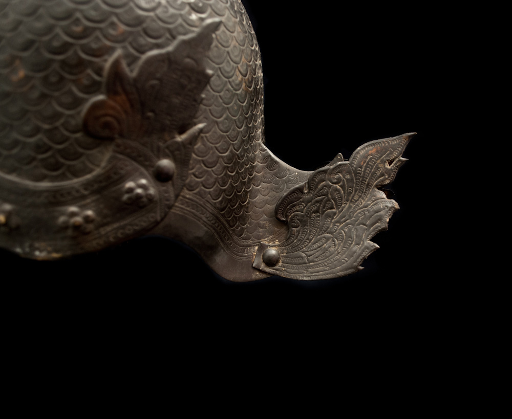 Excepcional elmo Tibetano em bronze, sendo o casco decorado com cinzelado em escamas debruado por faixa flamejante e encimado por um galo estilizado.