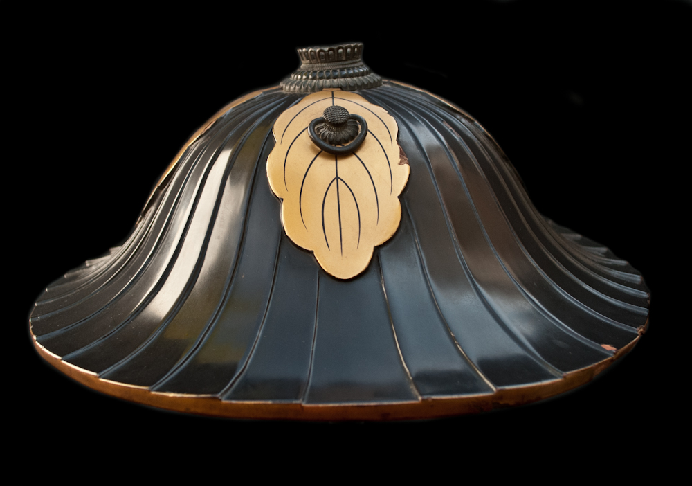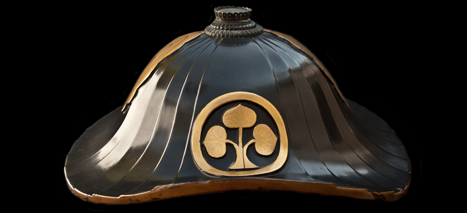 Black lacquered leather Jingasa. In the frontal zone, inside a golden circle, can be found a Kamon (family emblem) with a hollyhock (futaba-aoi or kamo-aoi), correspondent at the time with the Tokugawa family, the first shogun of the Edo bakufu.