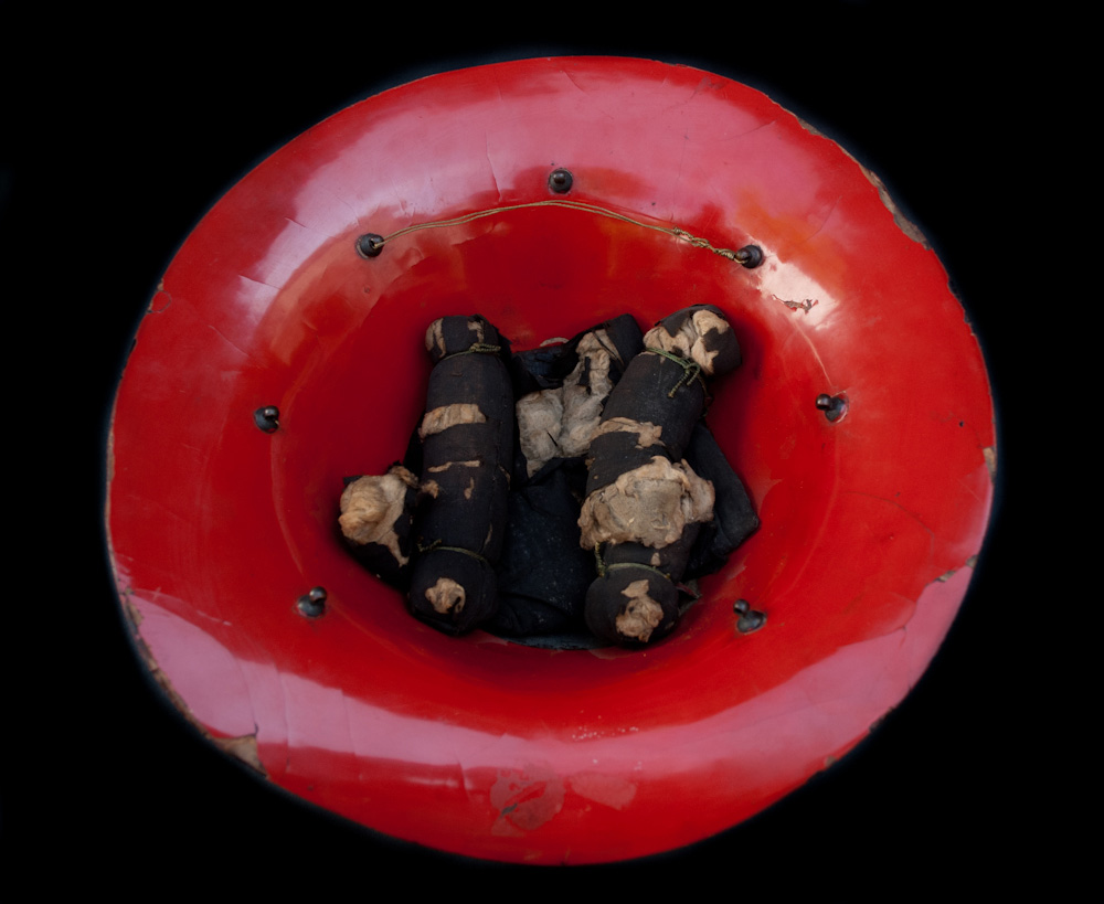 At the top, a brass circular embellishment. On the inside, of red lacquer, there are several eyelets in a circle, and part of the original lining.