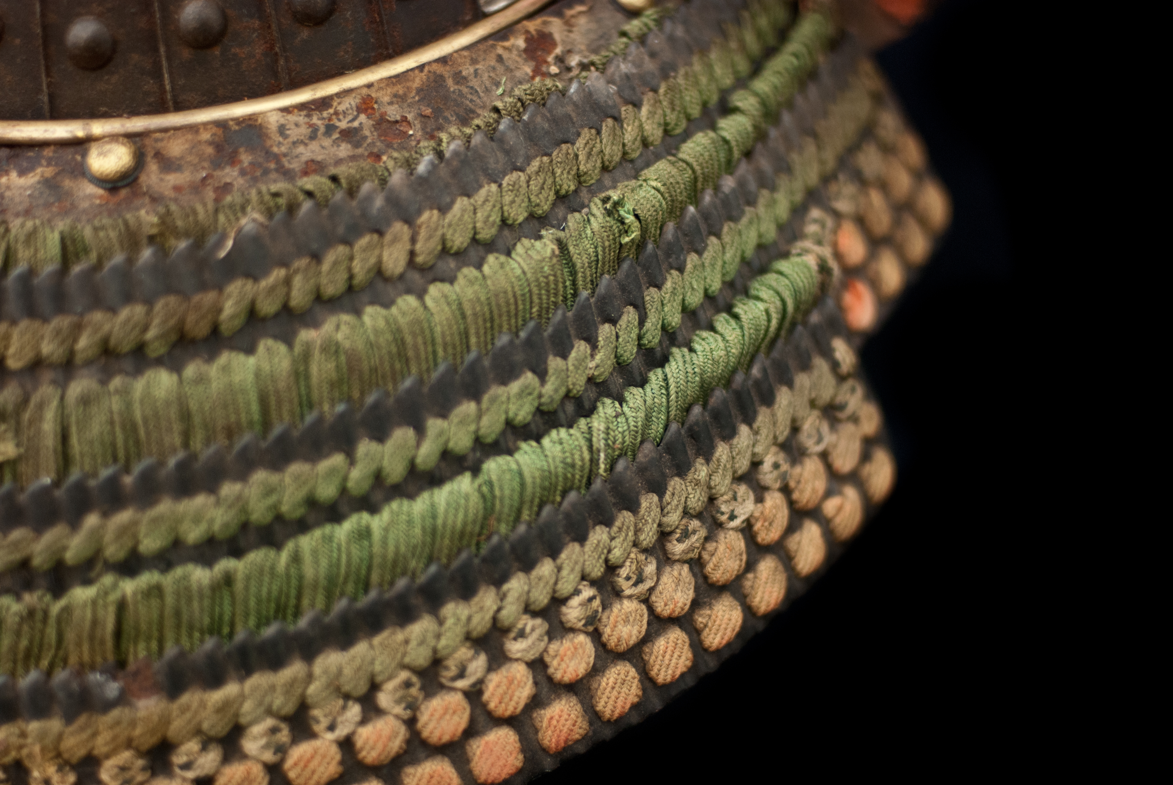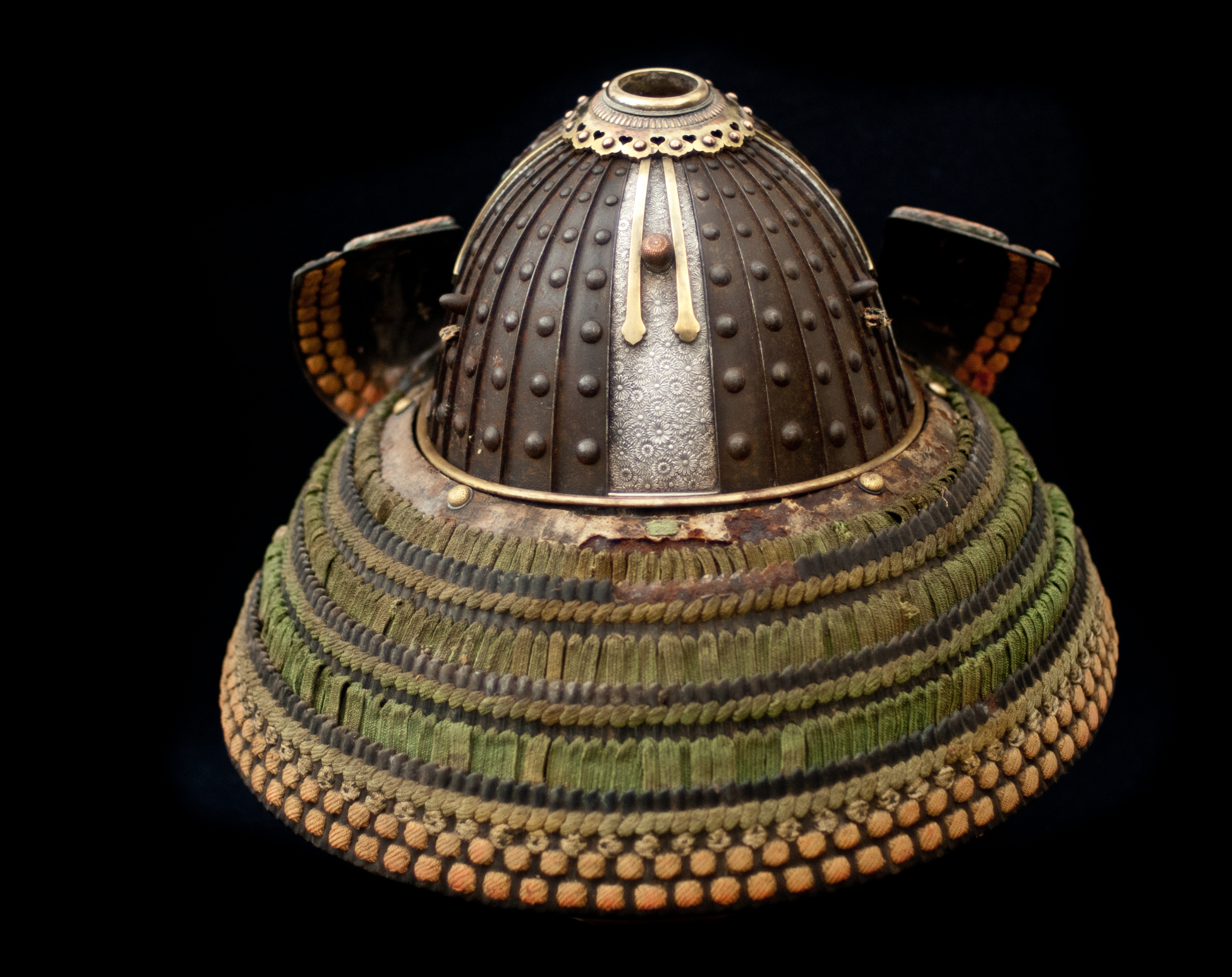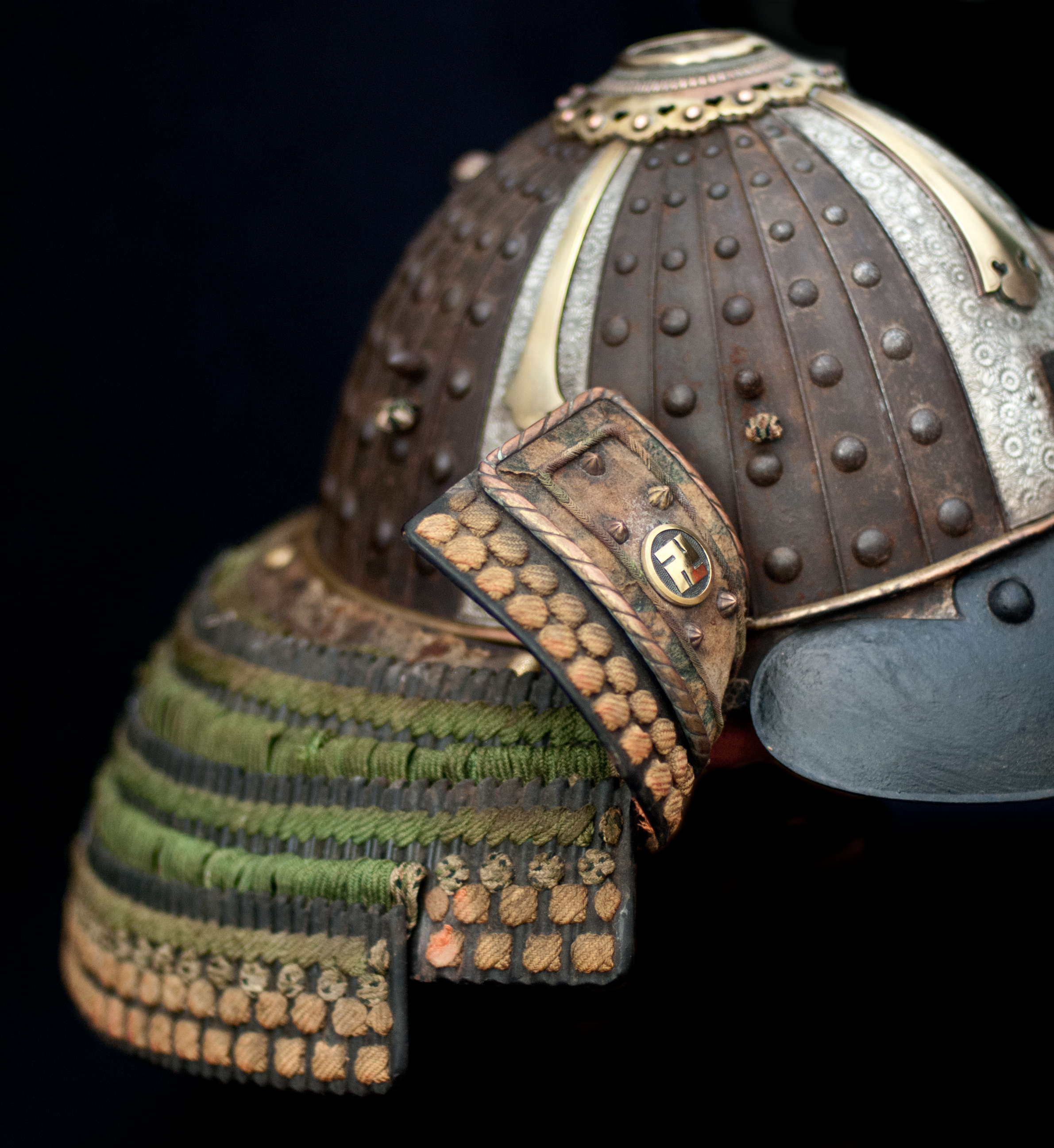 Constructed of twenty-six plates, four of which are covered with a silver plate chased with a dense pattern of chrysanthemum and secured by gilt copper ornaments, the remaining with projecting rivets punctuated by shiten-no-byo and hibiki-no-ana, a three-stage gilt-copper tehen kanamono to top, the bowl fitted with a three-lame lacquered-iron shikoro with gilt-accented fukigaeshi centered by gilt-copper mon with a manji character (wear).