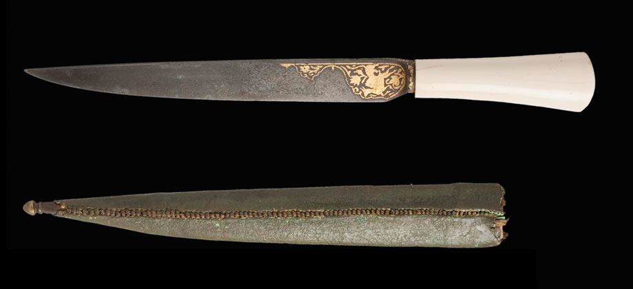 The hilt is built over the fitting of the blade, with a plaque of elephant ivory on one side, and a plaque of walrus ivory on the other.