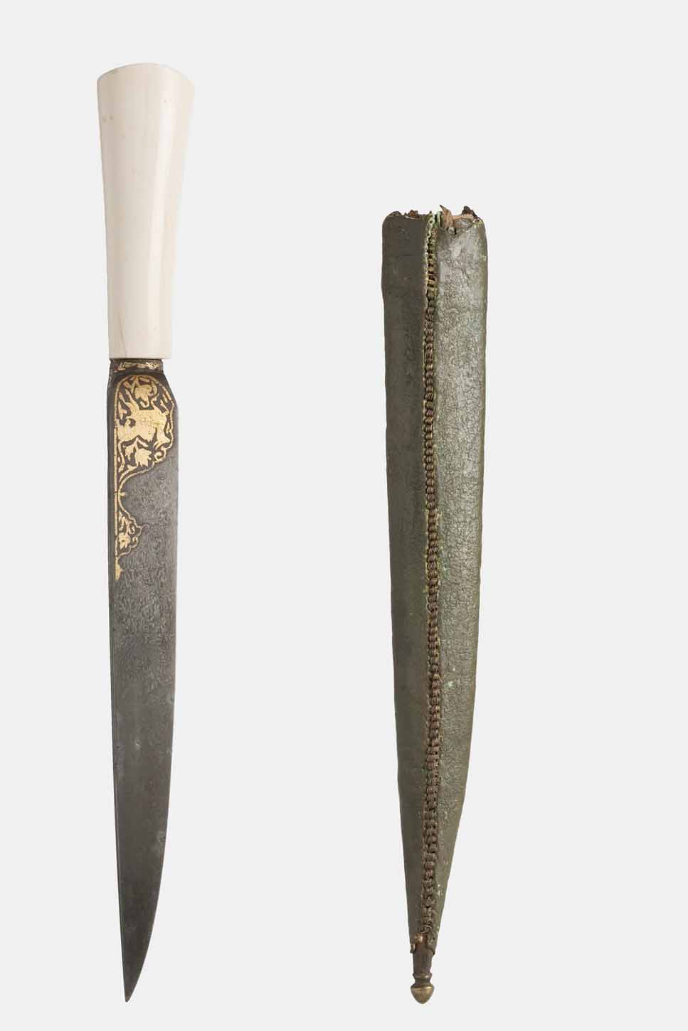 Aço, marfim de elefante e de morsa, ouro, couro, latão