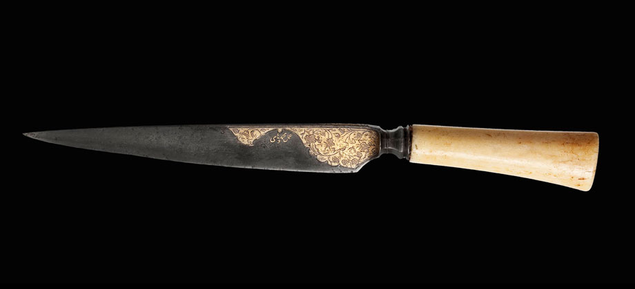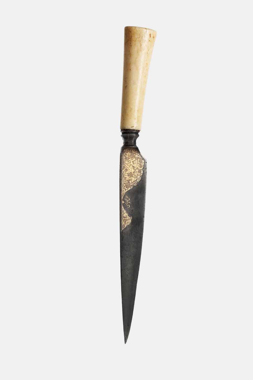 The blade, which is single edged and steel, is signed and dated “Work of Mohammed Hadi”, “Made in 1220” (AH. 1220 / 1805 DC.). The ricasso and the back display an ornamentation of floral motifs engraved and encrusted in gold, after the koftegari technique.