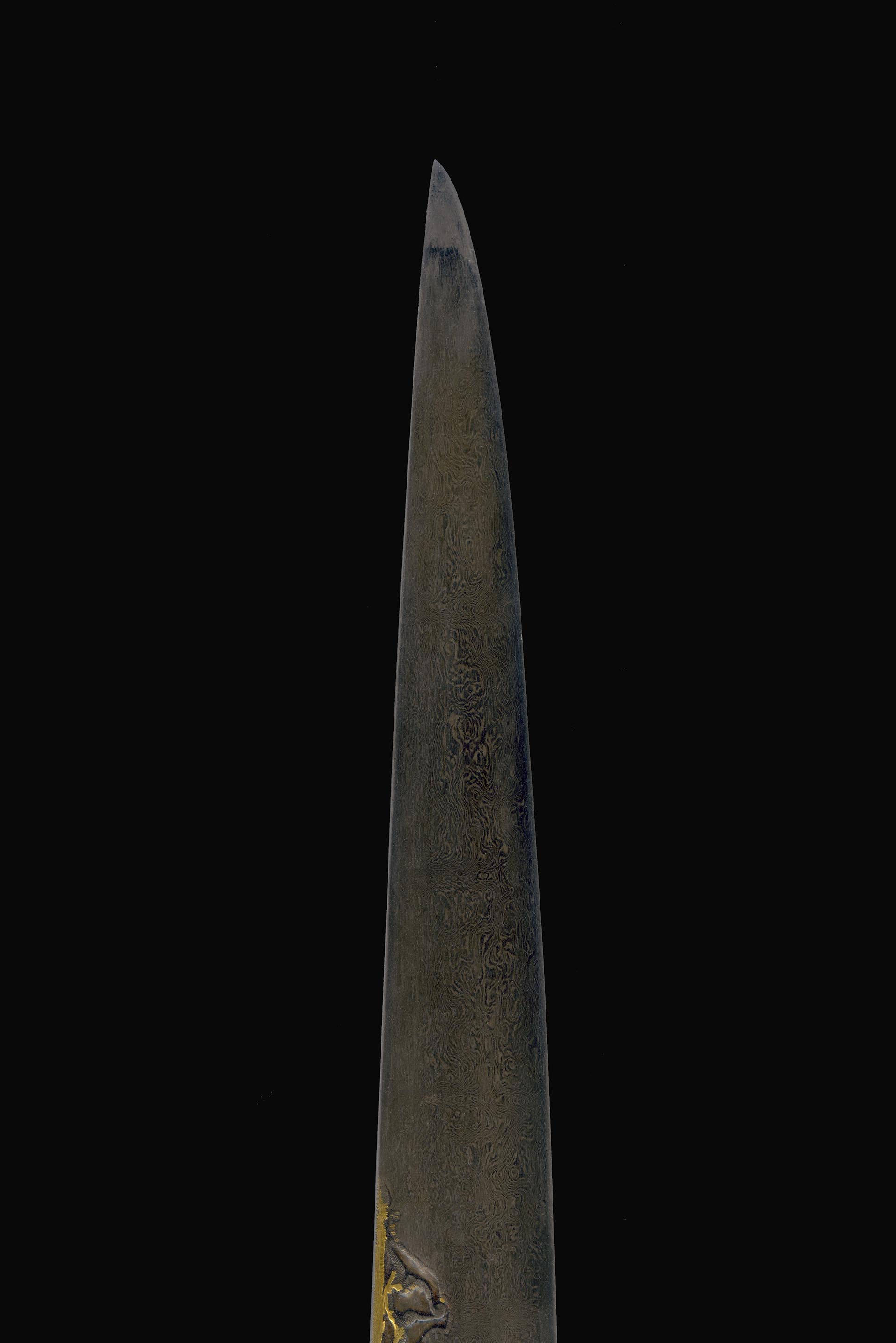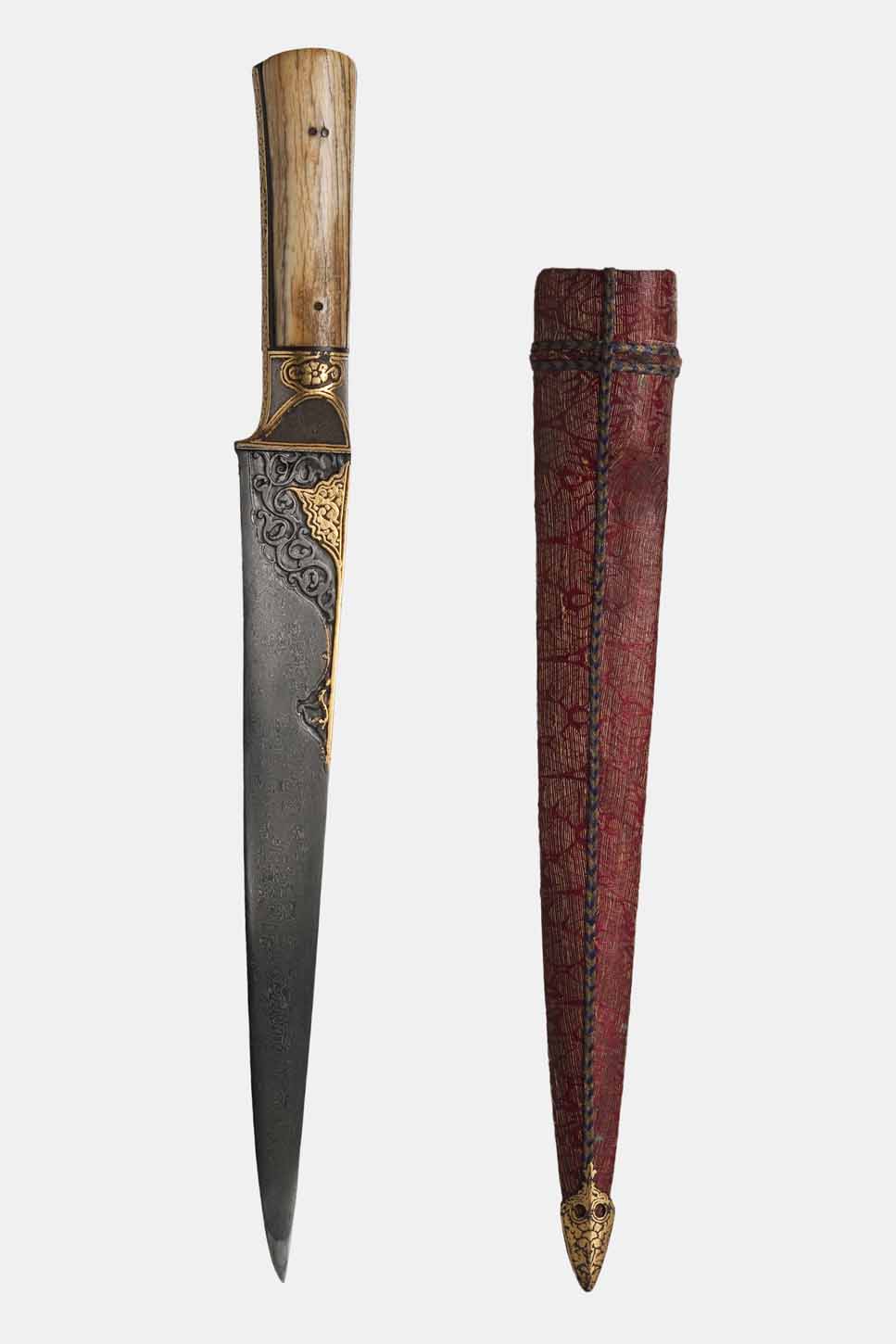 Aço, marfim de morsa, ouro, madeira, ferro, seda