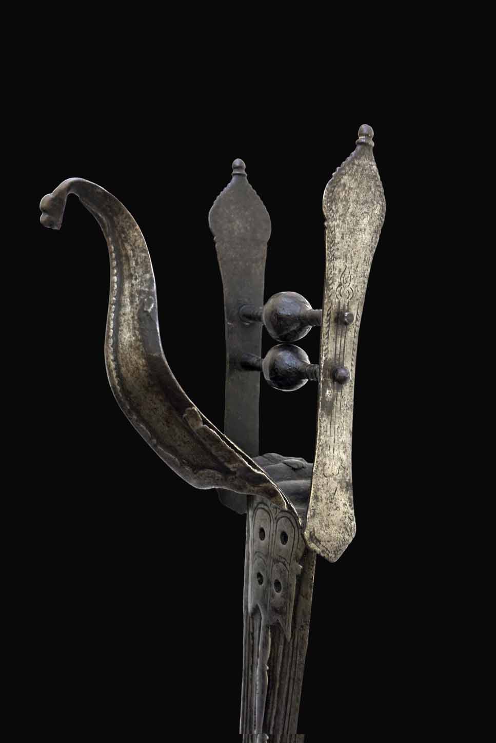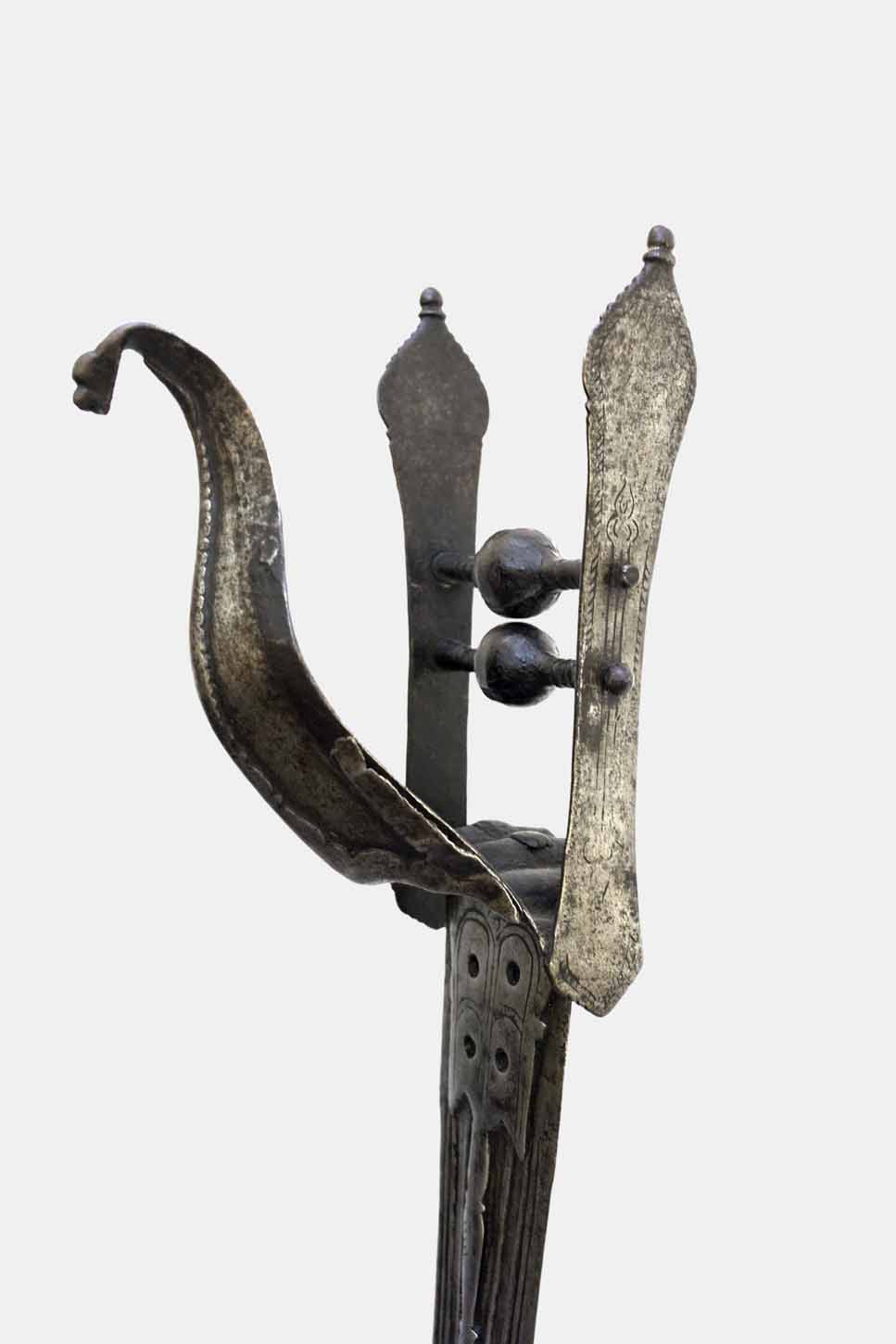 Its blade, with a double edge and made of steel, is quite long and shows reinforcement grooves which cover most of its area. A large iron guard for the protection of the hand and the forearm, a characteristic which distinguishes this piece from the other types of Katar, and which is only known in the Kingdom of Kerala (Tanjore) in Southern India.