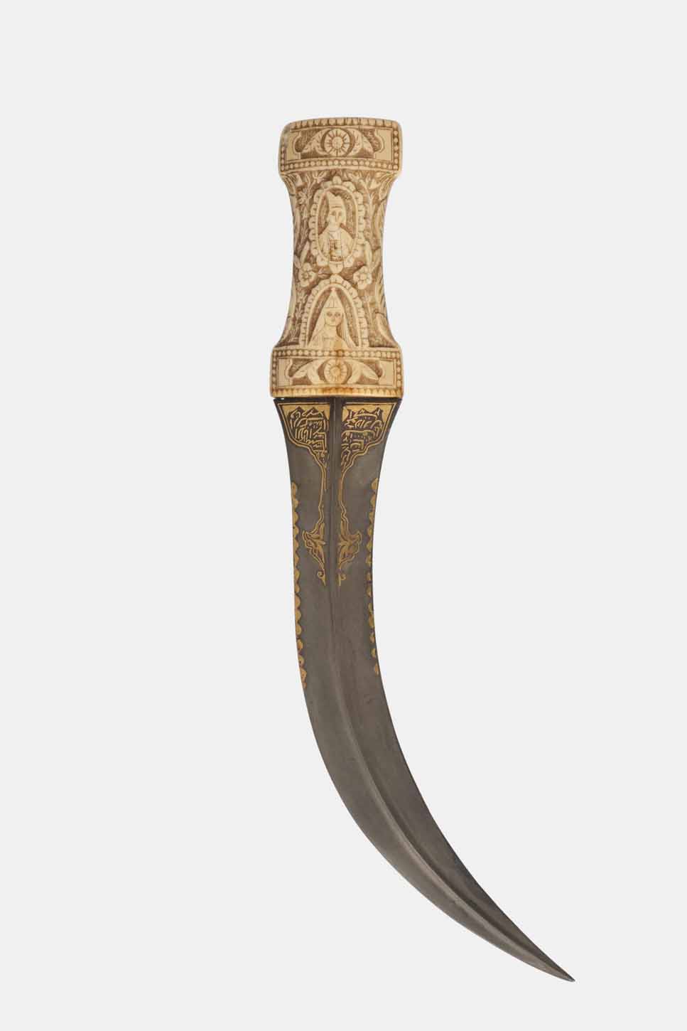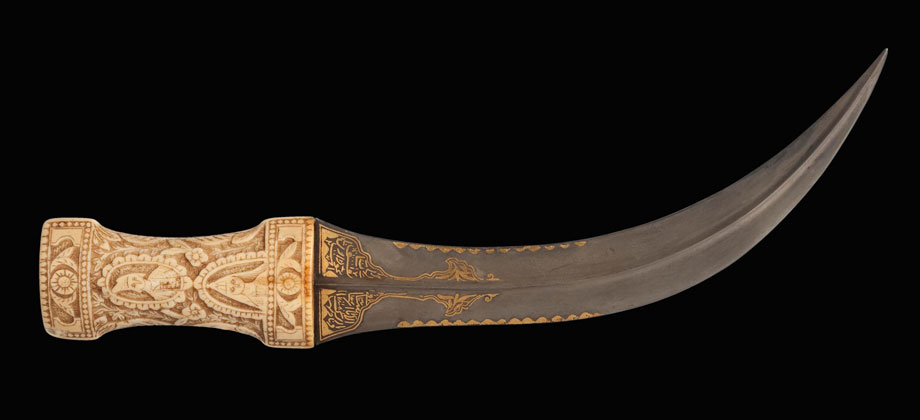 Khanjar is the Arabic word used to generically describe a dagger – a sort of bladed weapon, for defensive and piercing usage, with a double edged blade of strong tempered steel, either serrated or compact. In this piece, the blade is of watered steel and double edged, with a reinforcing groove in the centre. It has been decorated at its base with a large divided cartouche, with a mixed pattern of engraved and gold encrusted motifs, and intricate geometric lines and arabesques. In the same area, and throughout some of the blade’s edge, there is an indented ornament.