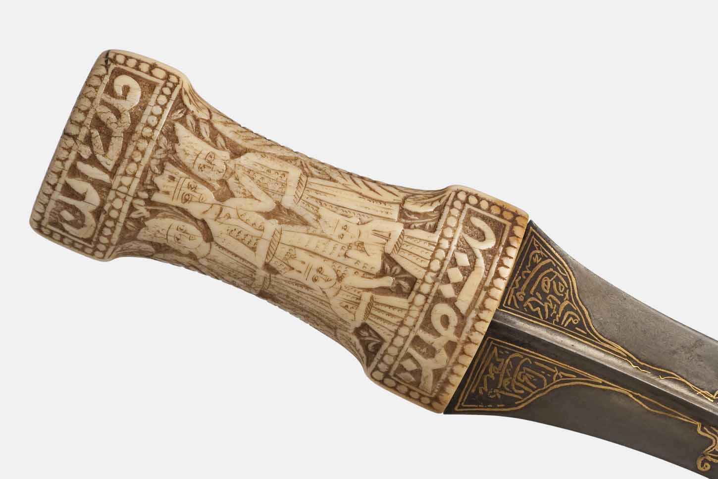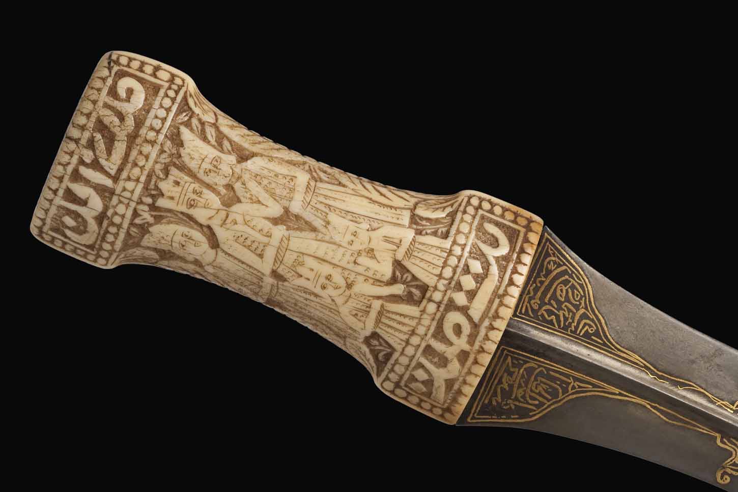 The ivory hilt is sculpted in high relief all around the handle, in a decoration displayed in three horizontal panels. On the side of the blade’s curve, in the central panel and over a background of flower motifs, there are two oval medallions with representations of male and female characters, at three quarters and full frontal. The panels at the base and top are framed in a pearly freeze and have a vegetal decoration. On the opposite side, in the central panel and in the foreground, one can observe two children, one of them wearing a crown, and in the background, a group of three male characters, one of them also wearing a crown.