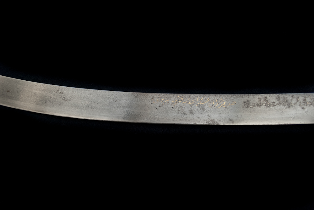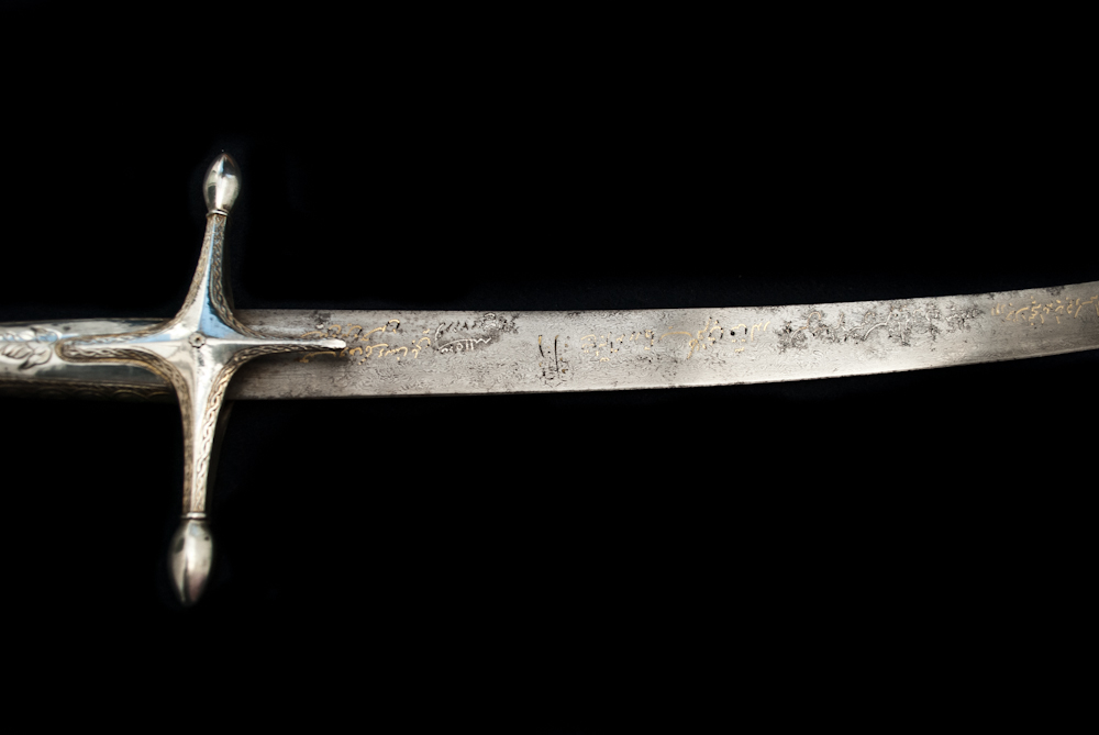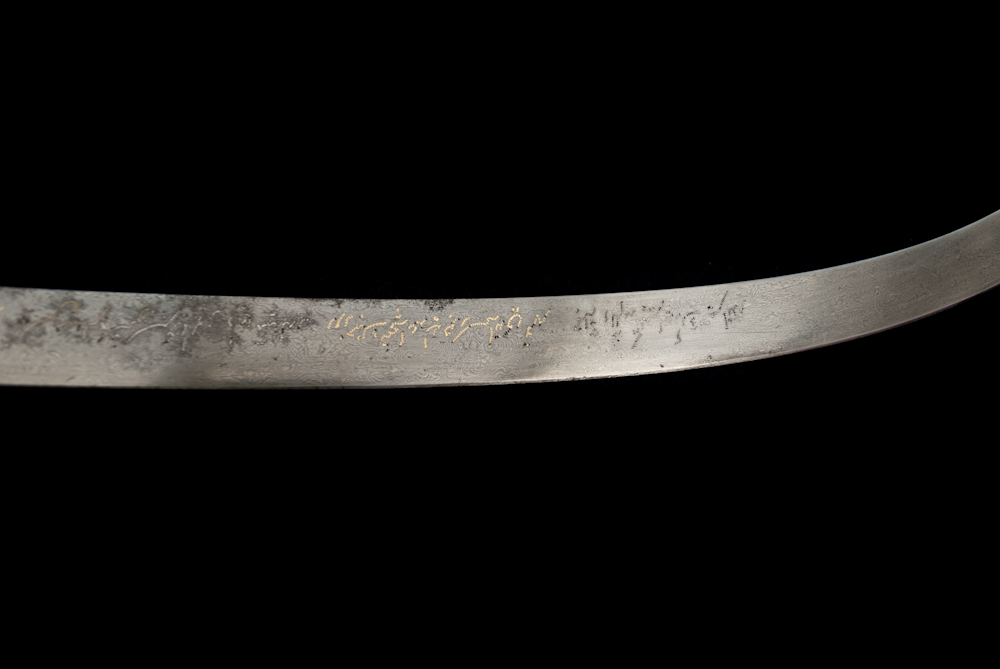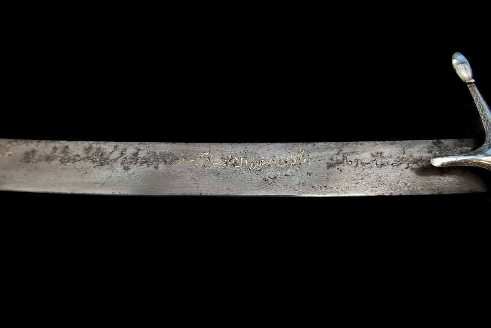 The blade displays Nastaliq writing on both sides, in silver and gold, with a cartouche displaying the signature of the maker. While difficult to make out, it seems to mark this piece as having been made in Ishfahan, in the Safavid period.