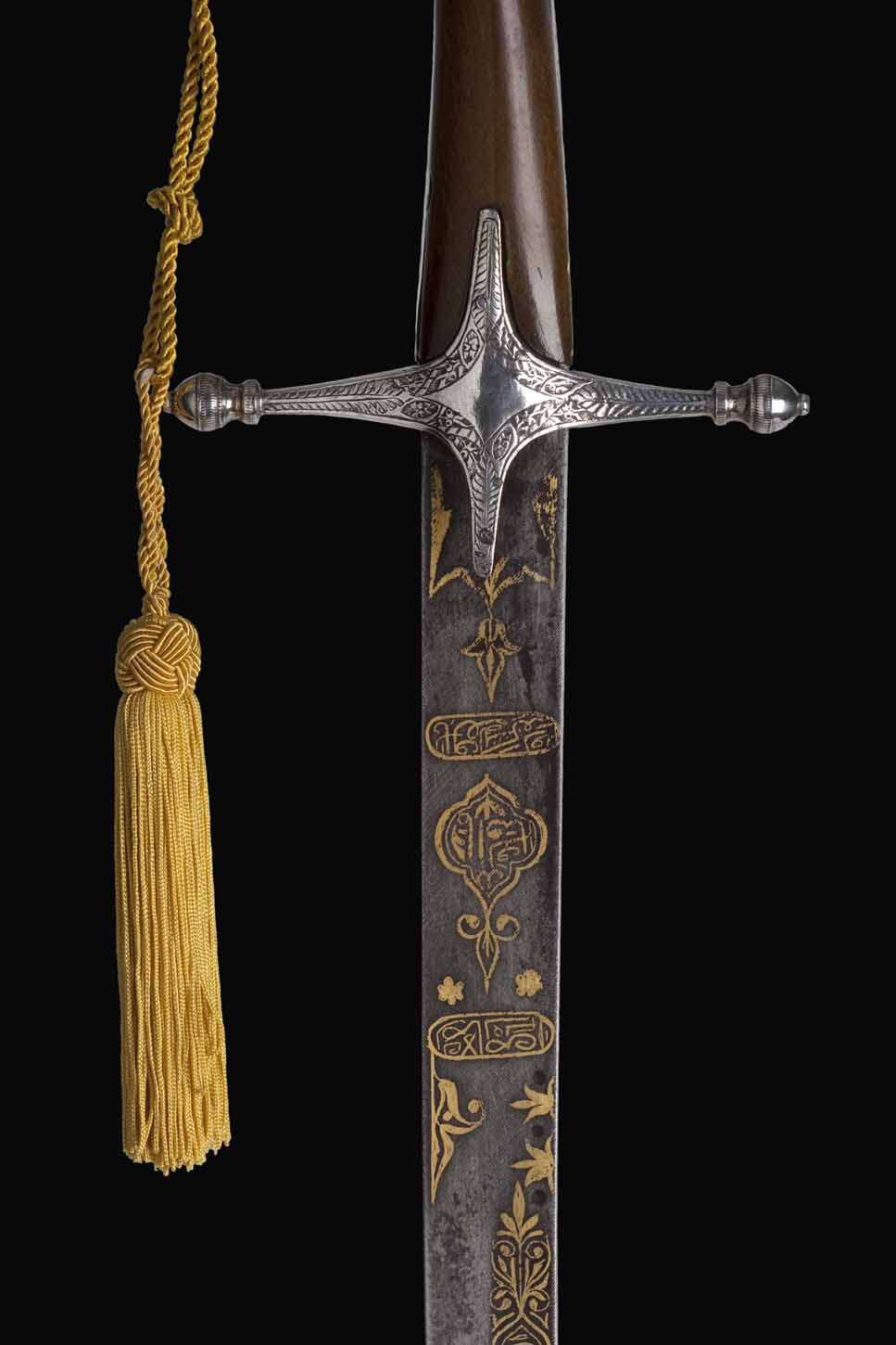Este exemplar, realizado no século XIX, integra uma lâmina de época anterior que data provavelmente do final do século XVI e início do século XVII, sugerindo a sua cuidada manufactura e composição decorativa, muitas semelhanças com as espadas persas. Ambos os lados, estão preenchidos por cartelas e reservas com inscrições e elementos vegetalistas, gravados e incrustados a ouro.