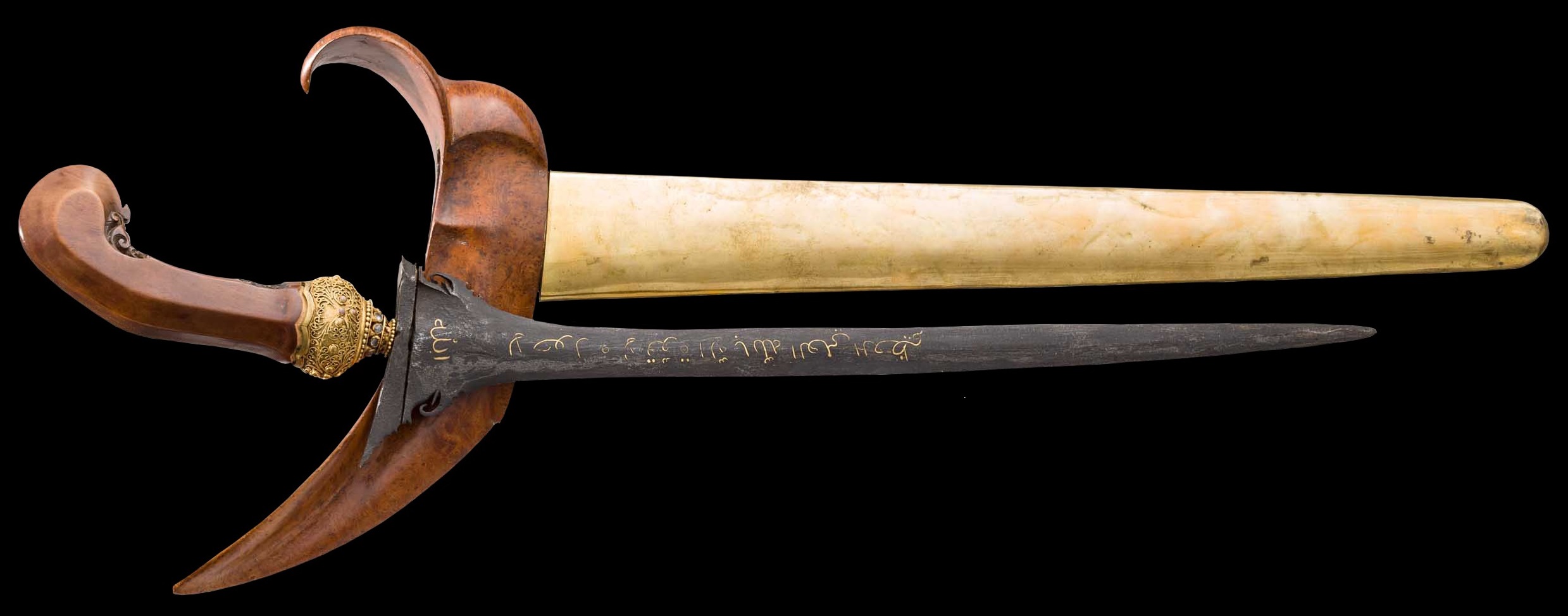 Straight blade (Dapur Lutus/Bener). Pattern (Pamor – melon peel), with Arabic inscription on both sides inlaid in gold (front side – “as a blessing from Allah, the most merciful; back side: “There is no power except that of Allah… Allahhuakbar”). On the side there are two sculpted elephant trunks (Sekar Kacang). Sculpted handle (Ukiran, typical of Surakarta) in wood. Selut in gilded silver filigree. Mendate of the Solo type, also in gilded silver decorated with gems (quartz). Wrangka of the Ladrang type, in one single piece of wood (walnut tree root) with the sheath (Gandar) in wood; with a punched-though Pendok, in more recent tin.