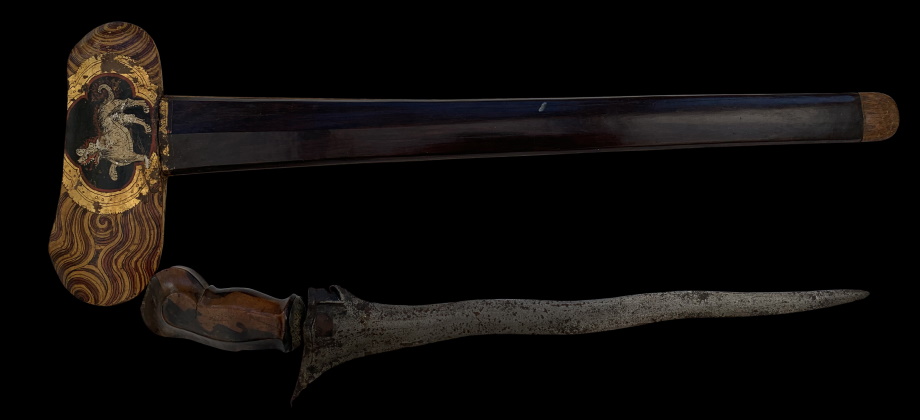A bainha ou gandar com a nau ou warangka tipo Gayaman Ladrang, exibe o pendohk executado na mesma madeira do punho.
