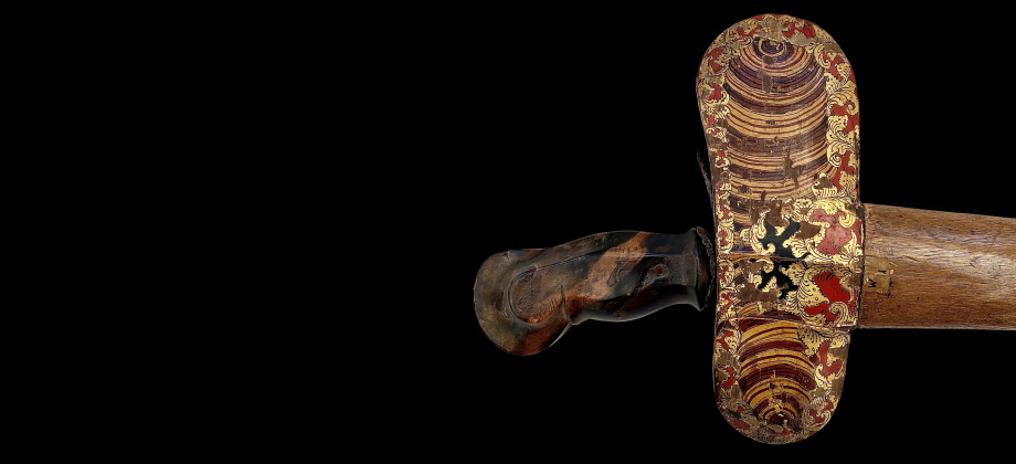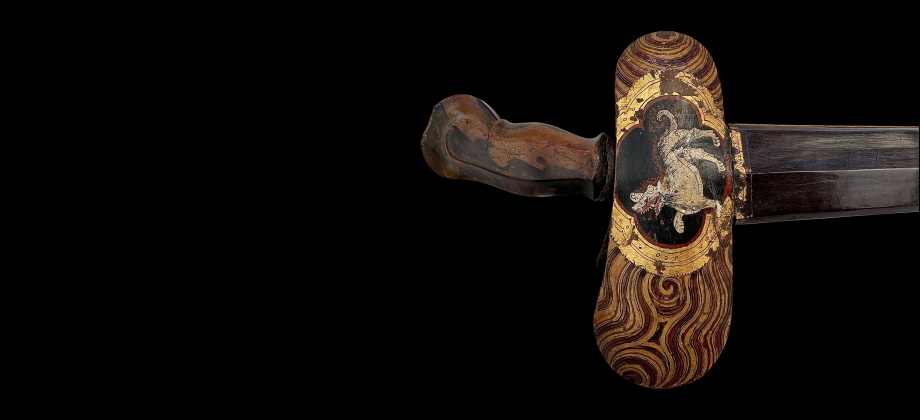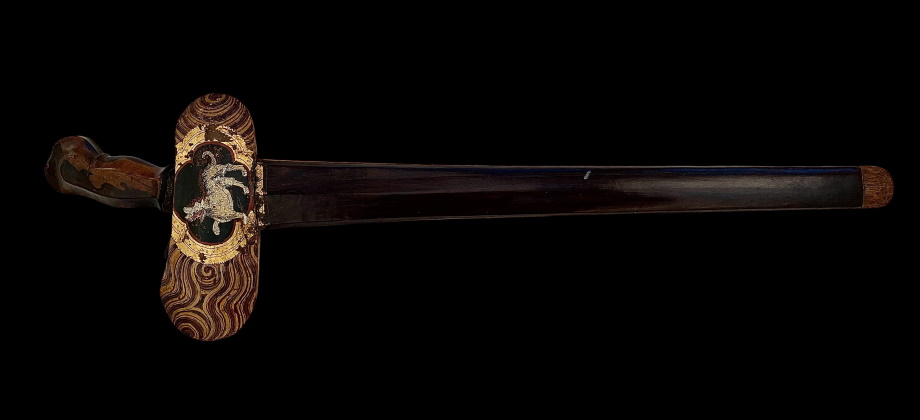 The hulu or hilt is sculpted from pinted wood or kayu pellet at the nposterior face with floral designs, anda at the frontal face with a mythical lion "Singa".