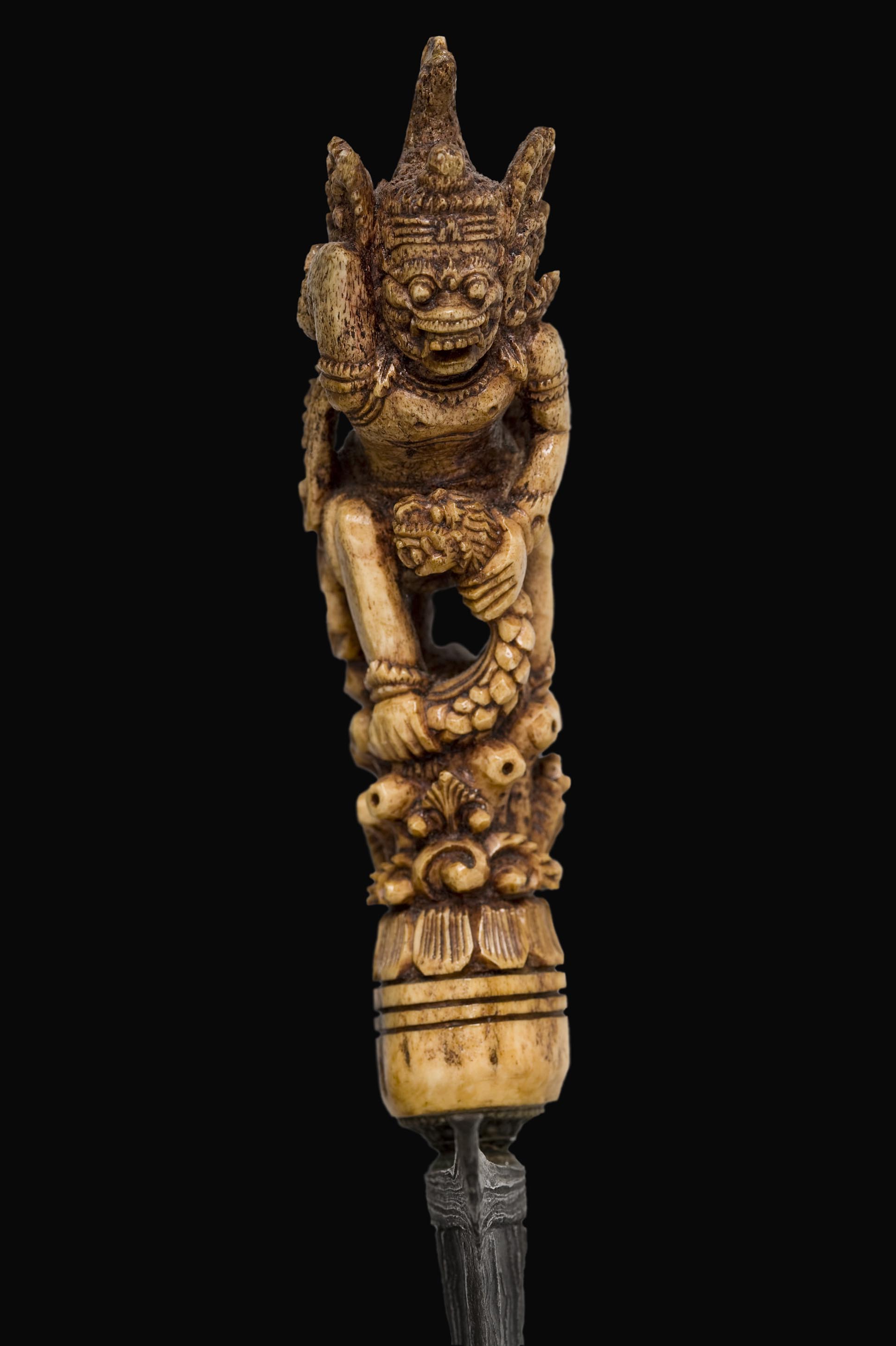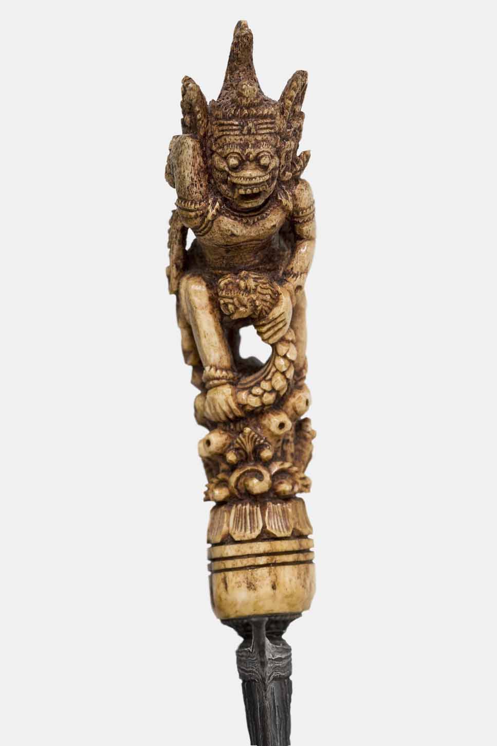 The hulu, hilt, made of porous bone, possibly a femur, is sculpted in the shape of the monkey-god Hanuman. This is strangling the serpent Naga Raja with one of his hands while he steps on it with his foot.