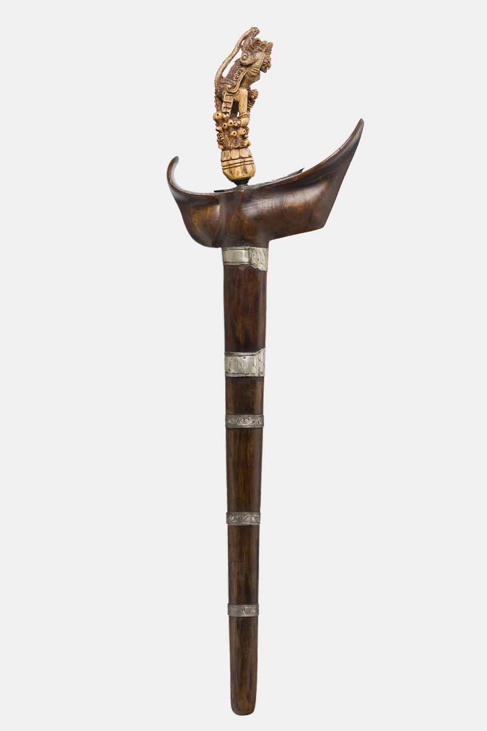 On the other hand he holds something he is taking from the serpent, probably an egg. It is an interpretation of a scene from the Hindu epic Ramayana. The pendok, scabbard, is all made from precious wood with silver mounts.