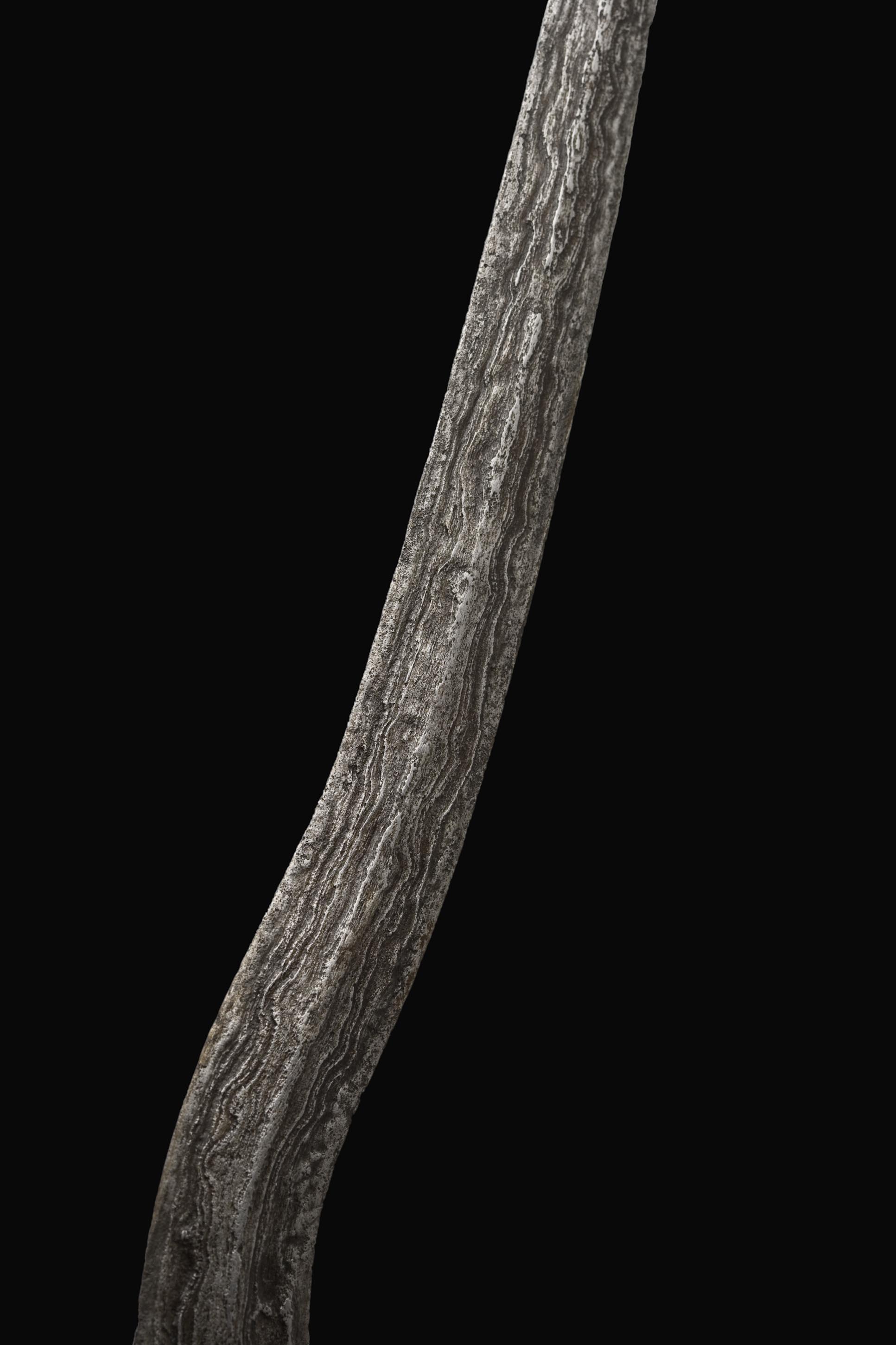 Originário das Índias Orientais, este Kris exibe uma lâmina de duplo gume, em aço damasquino, com um pamor, padrão, de “ondas”, com uma invulgar profundidade, revelador de uma manufactura notável, datada provavelmente do século XVI, se não for anterior. Possui três curvas dapur luk ou bener, relacionadas com o fogo - Agni -,“aquele que é três vezes três”, e mostra ainda duas ondas e a tromba do deus Ganesha.